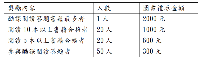 本活動結束後,將以抽籤方式獎勵參與學生,並將結果公告於酷課雲,其獎勵名額如下: