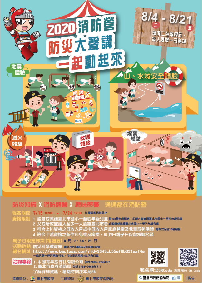 活動報名期間為109年7月15日10時至7月24日16時(如額滿即提前截止),相關報名資訊請至本局網站 (http://www.119.gov.taipei/)新聞稿區查詢。