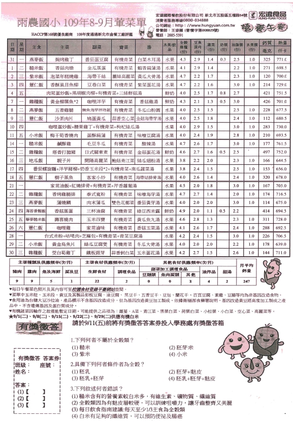 109學年度第一學期營養午餐菜單(8-9月)