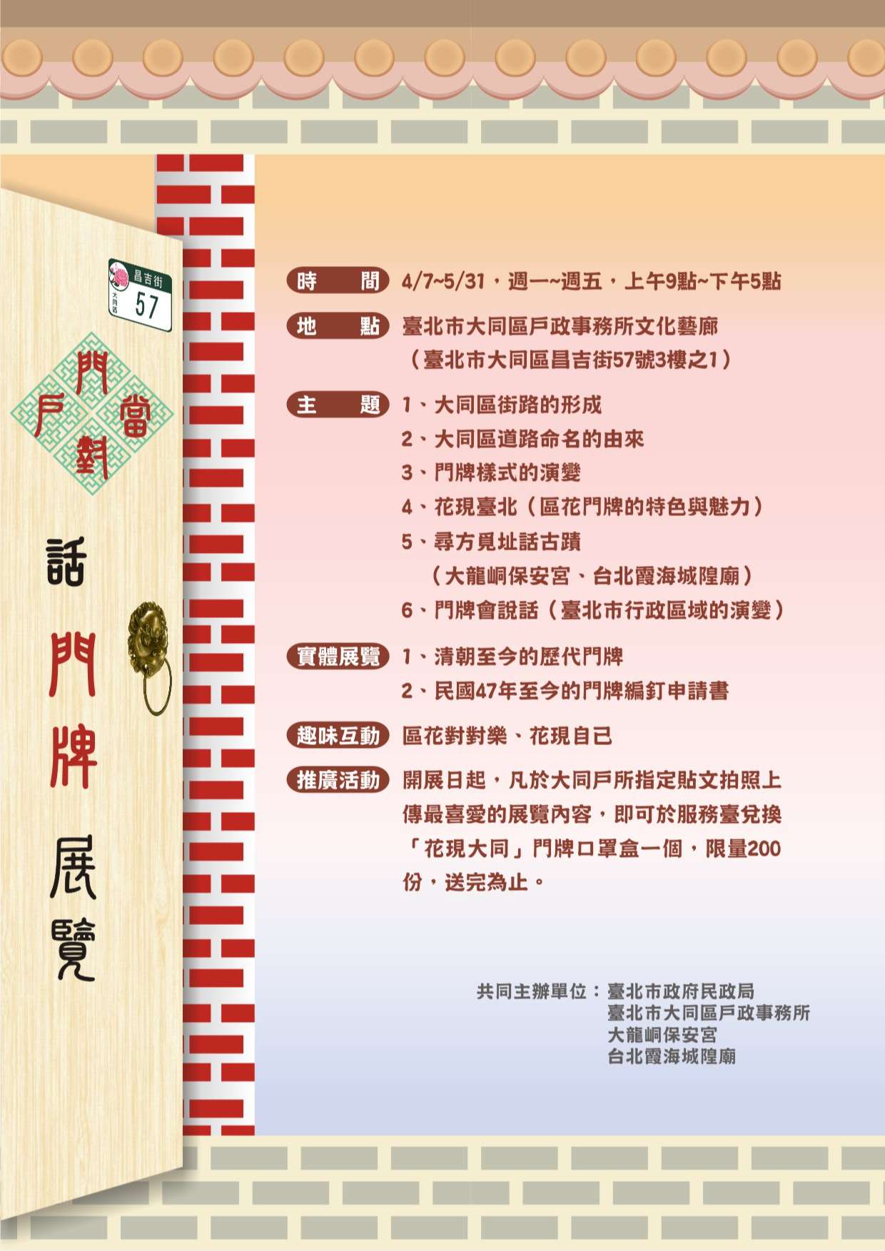 轉知臺北市大同區戶政事務所4月7日至5月31日辦理「門當戶對話門牌」展覽活動,歡迎踴躍參觀。詳請參閱電子海報。