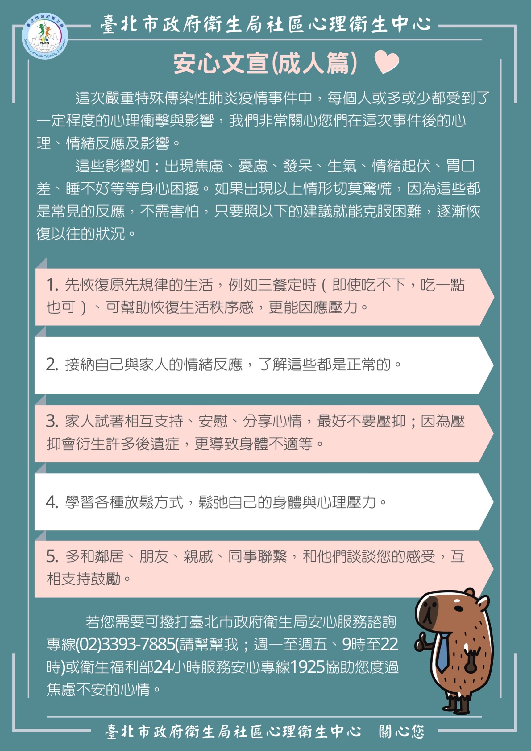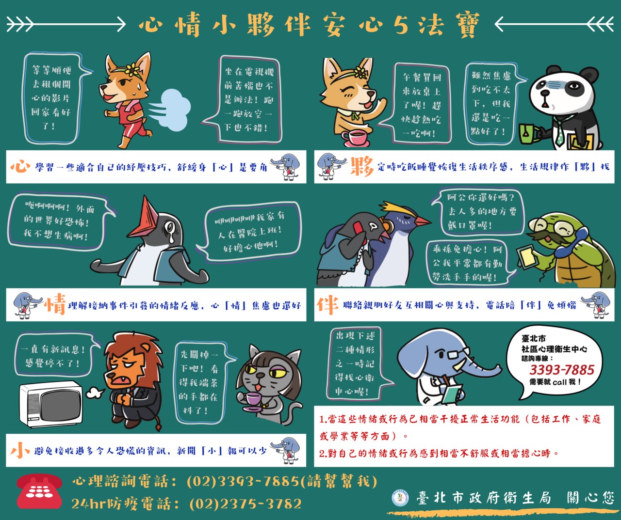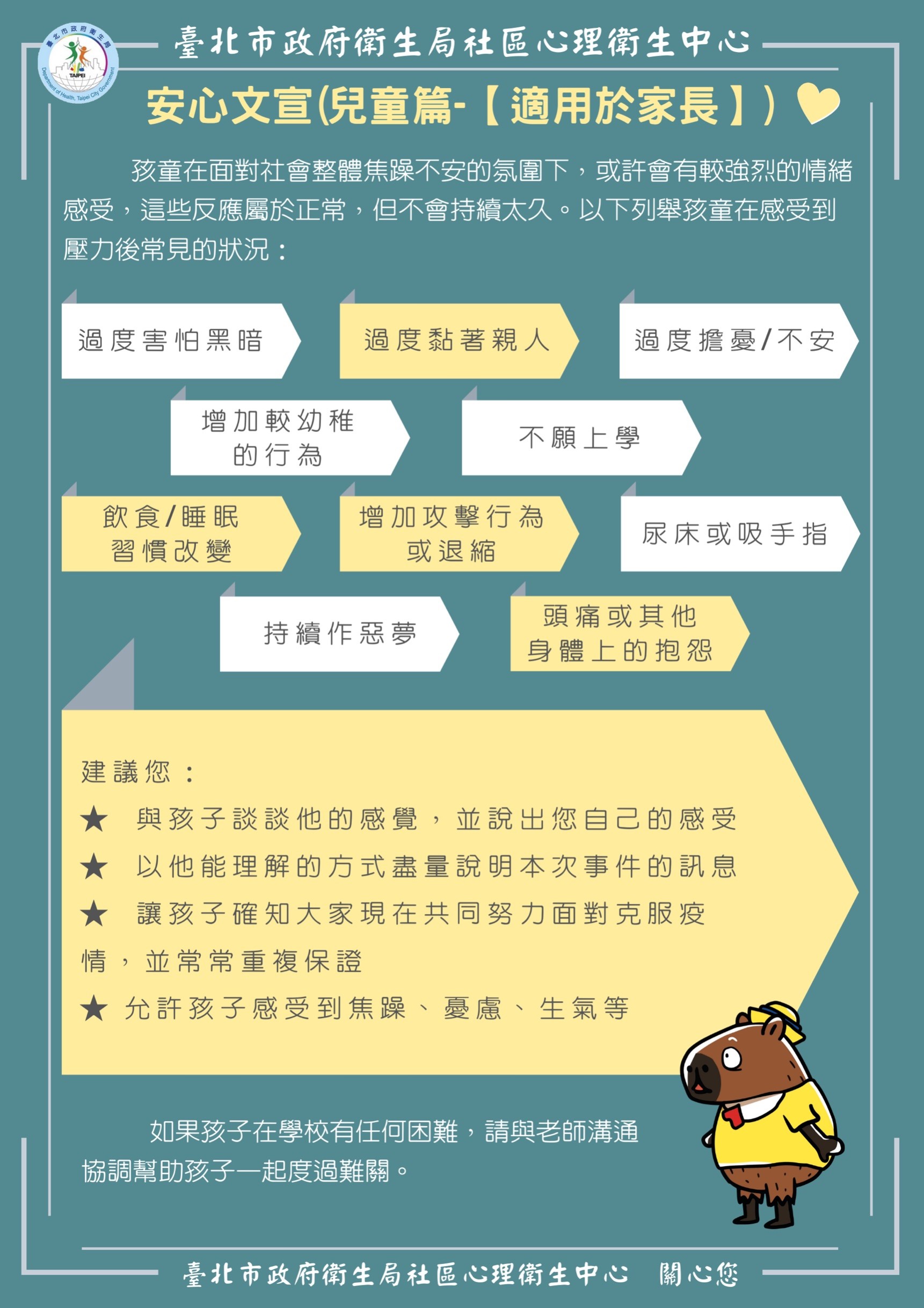 面對新型冠狀病毒疫情的發展,心理上難免感到不安,甚至是害怕、焦慮。提醒您留意身體健康的同時,也要正視隨之而來的心理壓力,關注自身的心理照顧。輔導室提供一些資訊,方便您瞭解這段期間自身及孩子的身心狀況,讓您了解與接納孩子的反應,共同協助孩子渡過這次疫情可能帶來的影響,讓我們一起陪伴與關心孩子的心情。