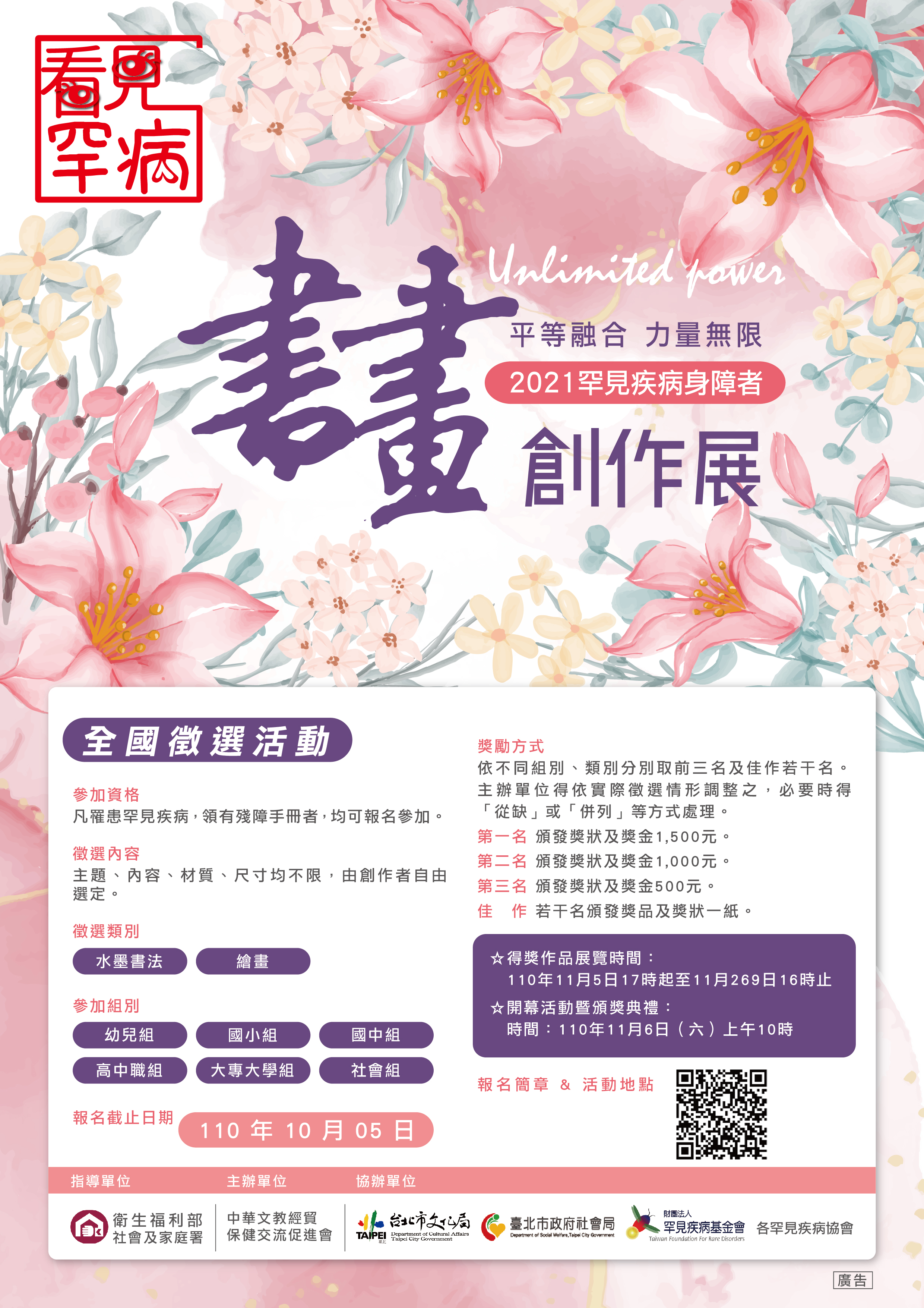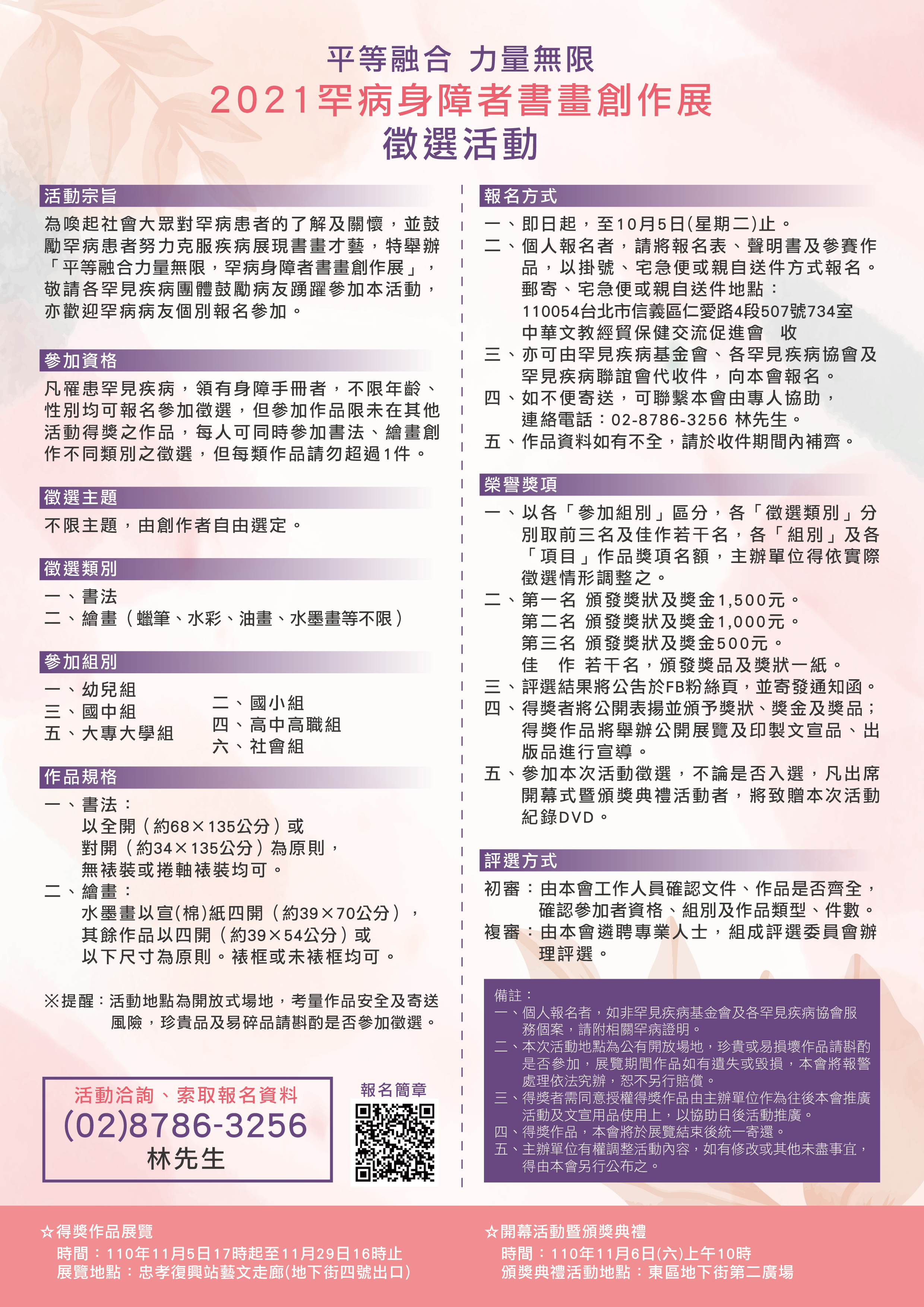一、中華文教經貿保健交流促進會為喚起社會大眾對罕病患者 的了解及關懷,並鼓勵罕病患者努力克服疾病展現書畫才 藝,特舉辦旨揭活動。