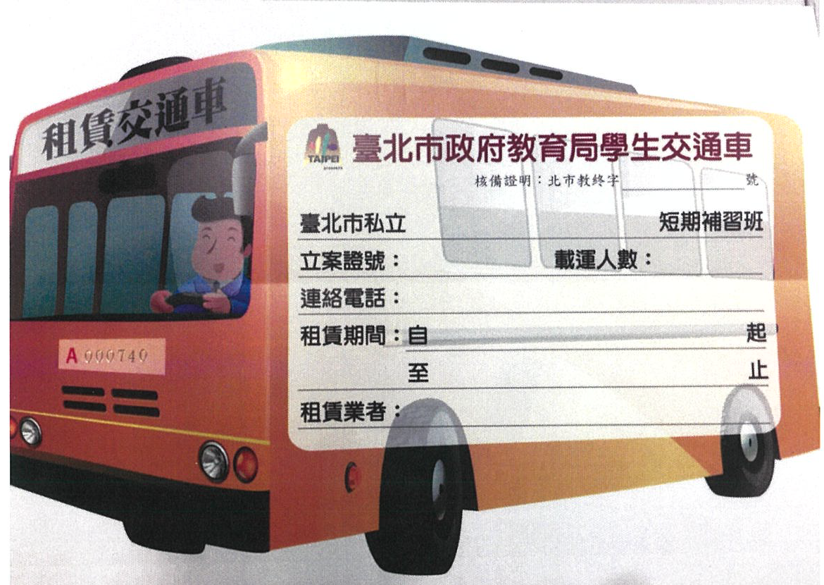 依據學生交通車管理辦法第6條第2項規定:「租賃之學生交通車,應於前後車窗及駕駛座左右外側標示清晰可識之學生專車校(班)、中心名稱、電話、載運人數,短期補習班及兒童課後照顧服務中心租賃者,並應加註立案字號。」