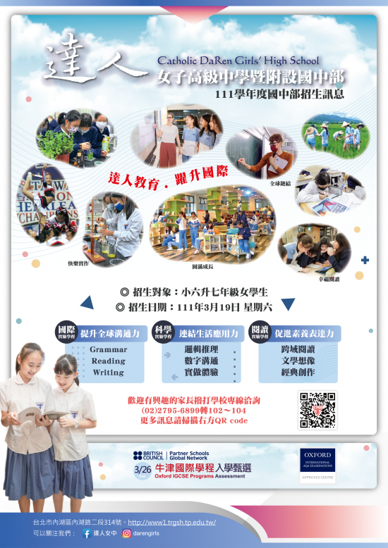 七、本校達人女中新生家長說明會及七年級新生綜合能力探索活動相關訊息及說明均上載於本校網站,網址為http://www1.trgsh.tp.edu.tw,請貴校惠允協助將本活動訊息網路公告周知,並鼓勵六年級女學生及家長踴躍報名參加。