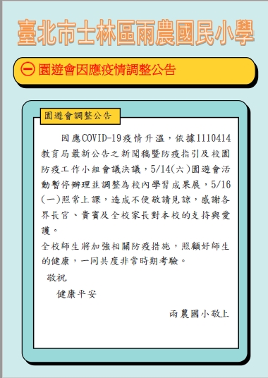 5/14(六)園遊會活動暫停辦理並調整為校內學習成果展,