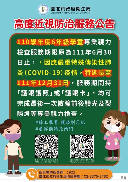 均可接受1次專業視力檢查服務;另6年級應屆畢 業生(110學年度)服務期限原至111年6月30日前,
