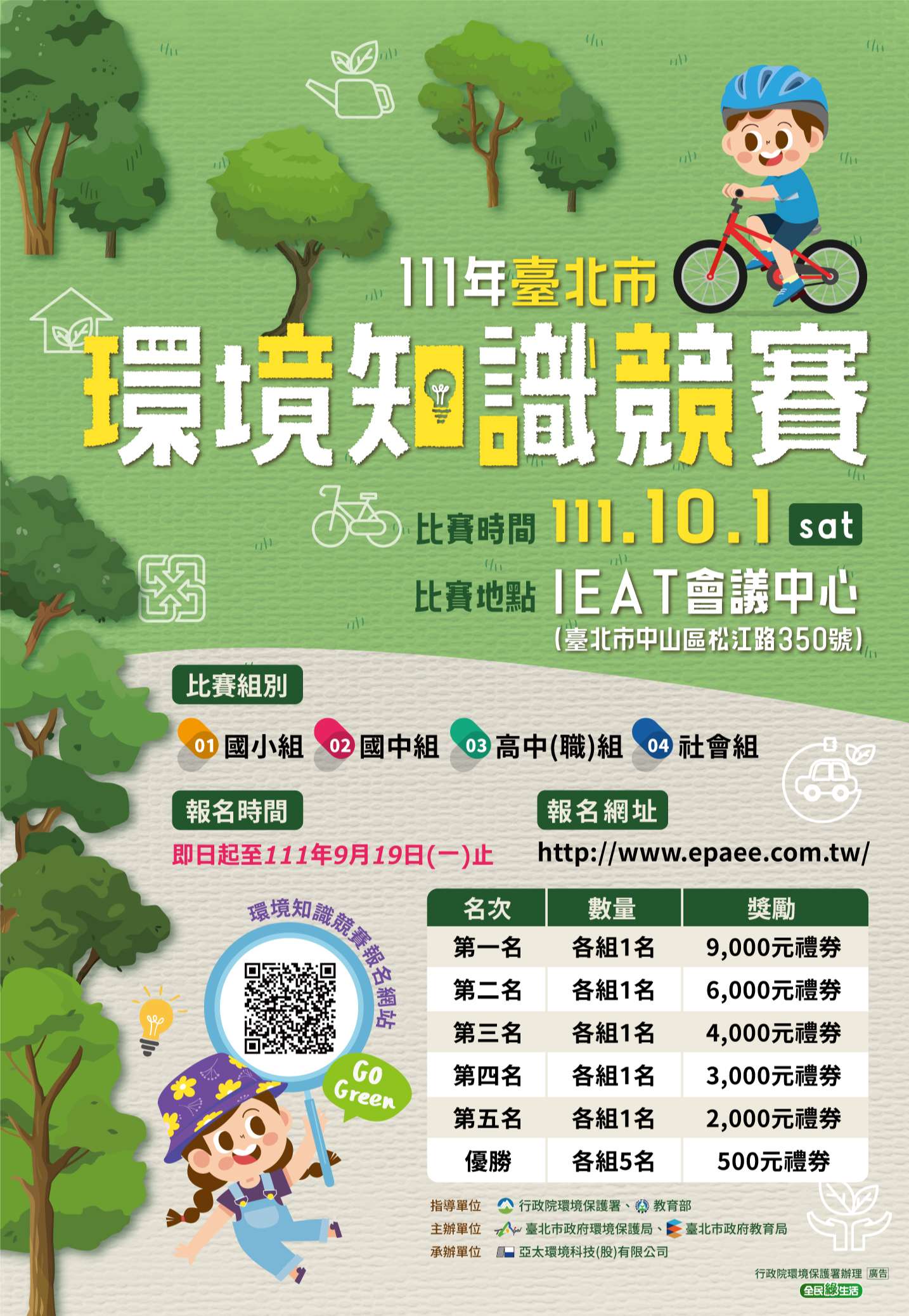 臺北市「111年環境知識競賽」訂於111年10月1日(星期 六)假IEAT會議中心舉行,歡迎學生踴躍報名參加。