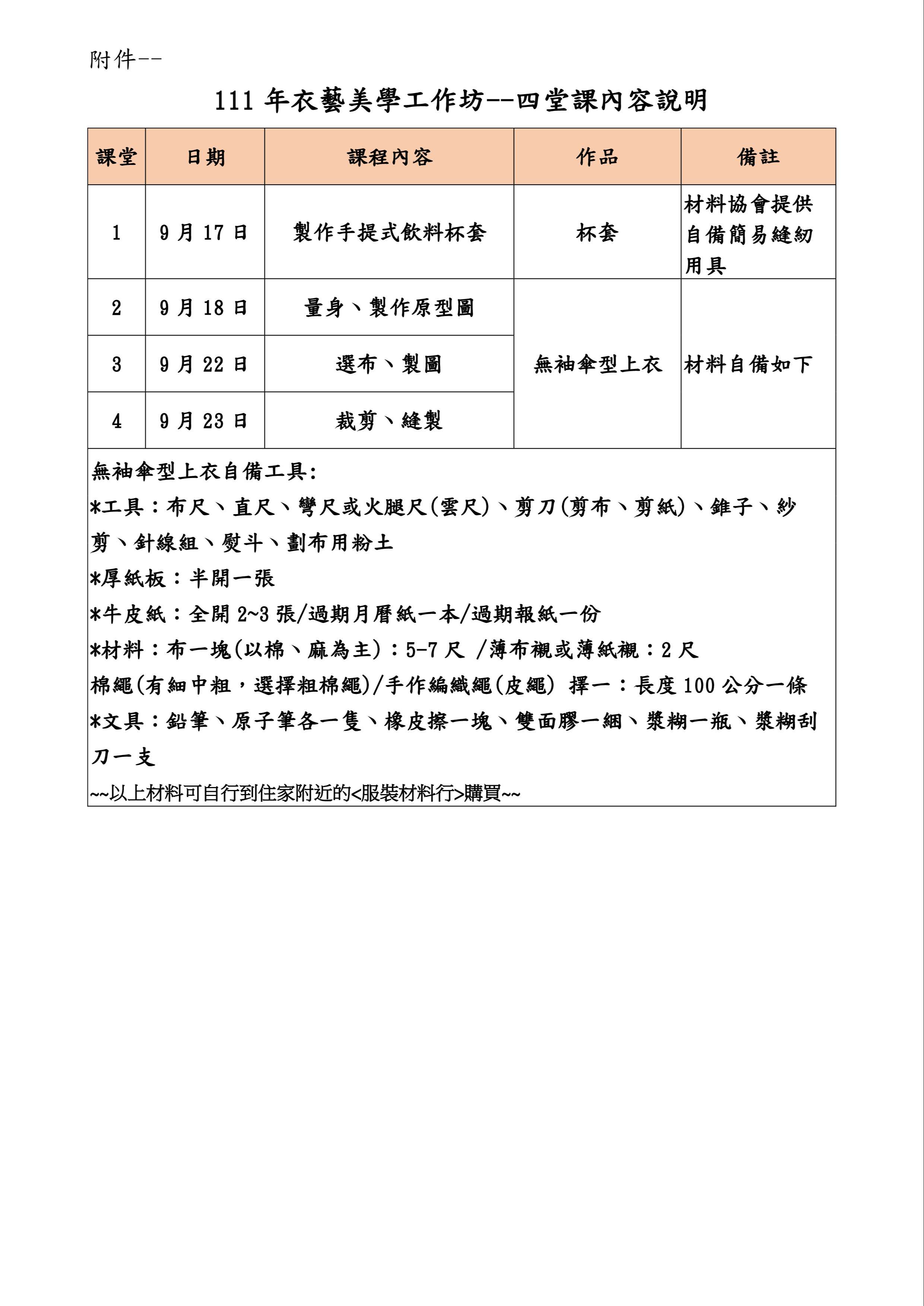 四、報名方式:請至本會網站www.chinesenpo.org.tw→活動專 區→研習專區→『111年度衣藝美學工作坊』進行報名,謝 謝!