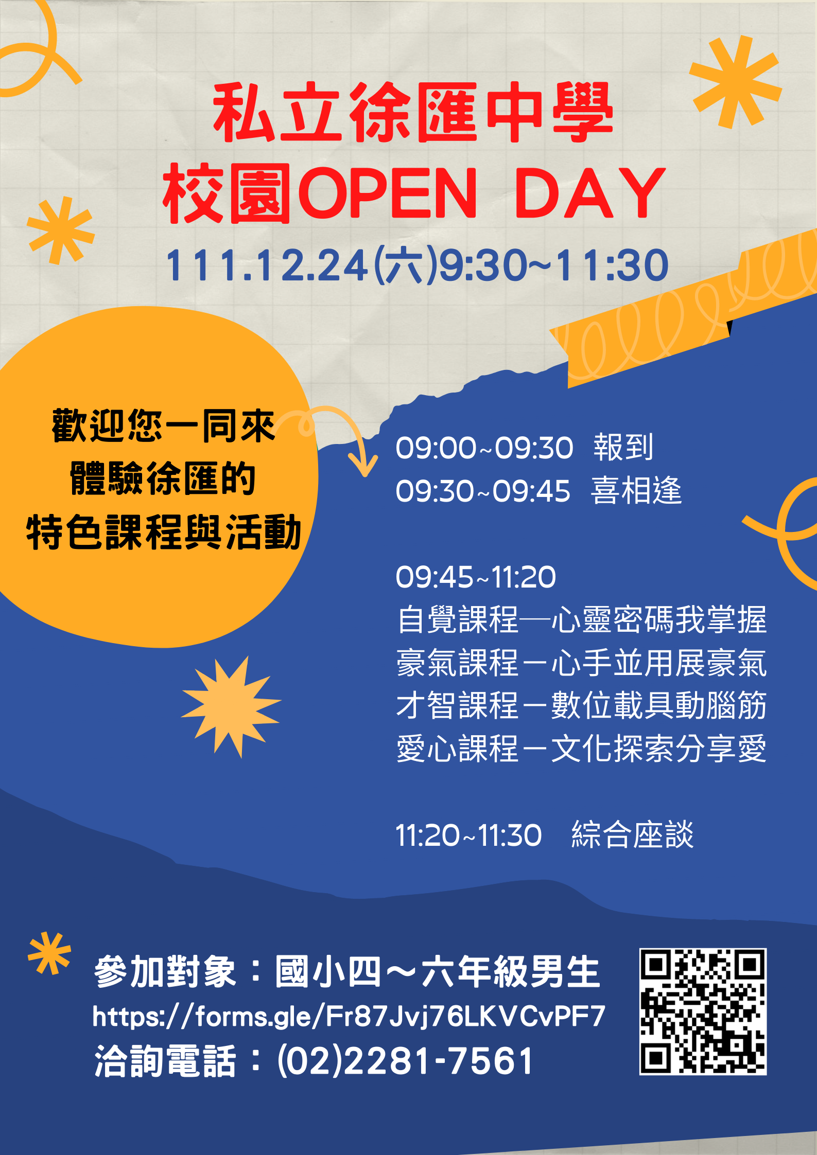 一、本校著重培育學生具備自覺、才智、愛心、豪氣四大能 力,歡迎國小學生參加本校辦理之「徐匯OPEN DAY」,親自體驗本校特色課程及特色活動。