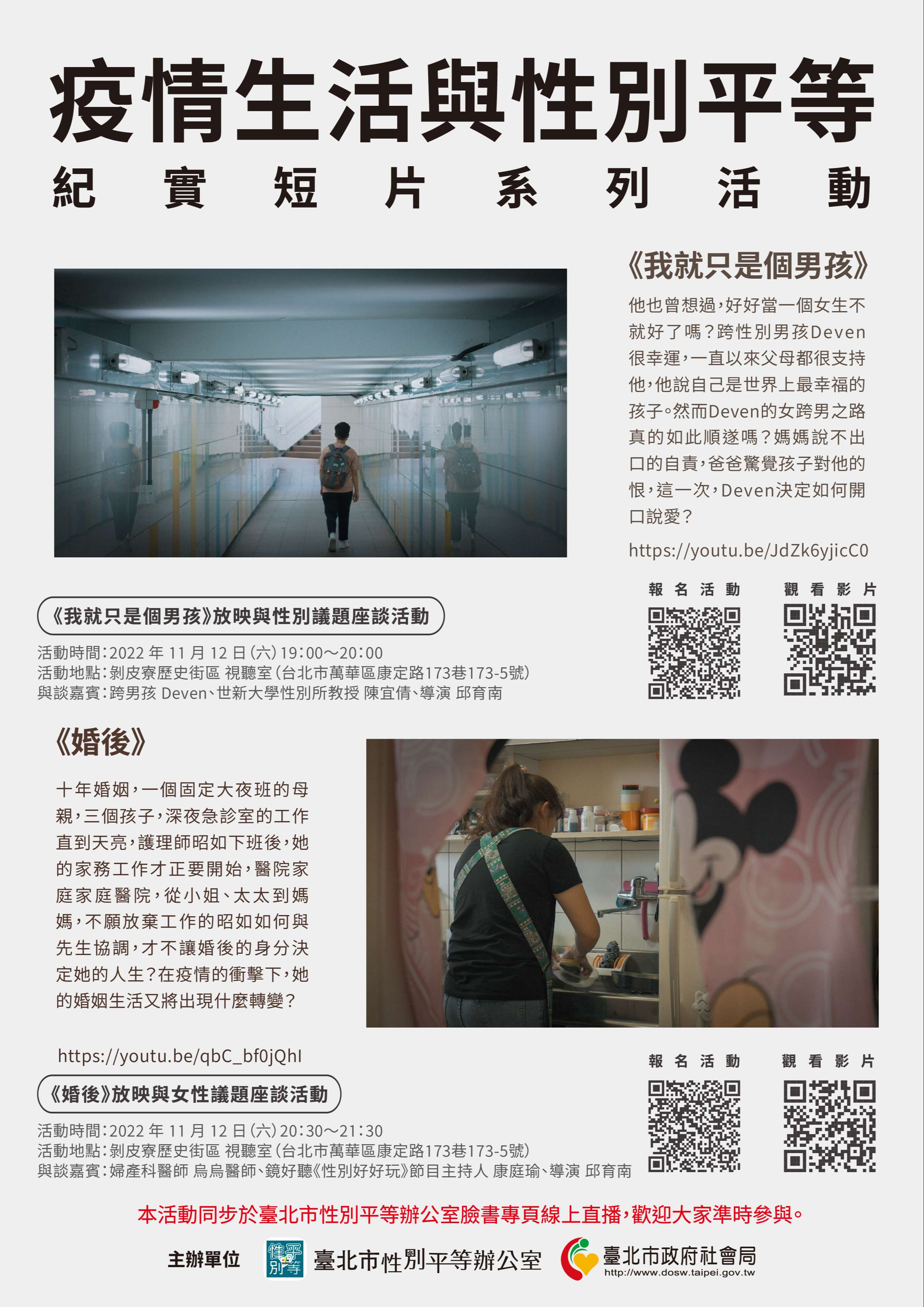 一、臺北市性別平等辦公室為擴展性平議題宣導之多元性與豐富性,本年度聚焦「疫情生活與性別平等」,分別製作《我就只是個男孩》及《婚後》2支紀實短片: