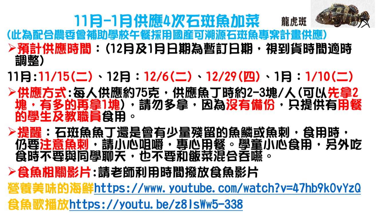 因應政府石斑魚加菜,本校午餐群組供應時間為11/15(二)、12/6(二)、12/29(四)、1/10(二)(12月-1月的供應時間,仍會視實際到貨時間進行調整而有變動。)