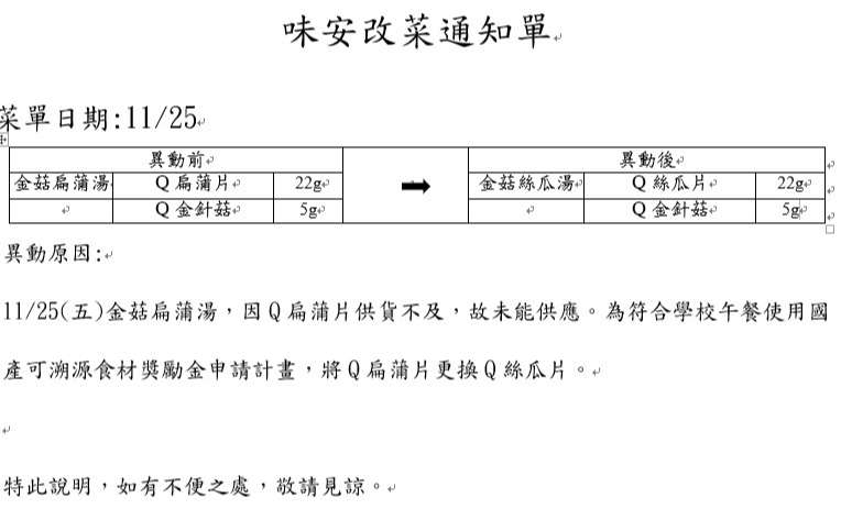11/25(五)金菇扁蒲湯,因Q扁蒲片供貨不及,為符合學校午餐使用國產可溯源食材獎勵金申請計畫,將Q扁蒲片更換Q絲瓜片。 特此說明,如有不便之處,敬請見諒。