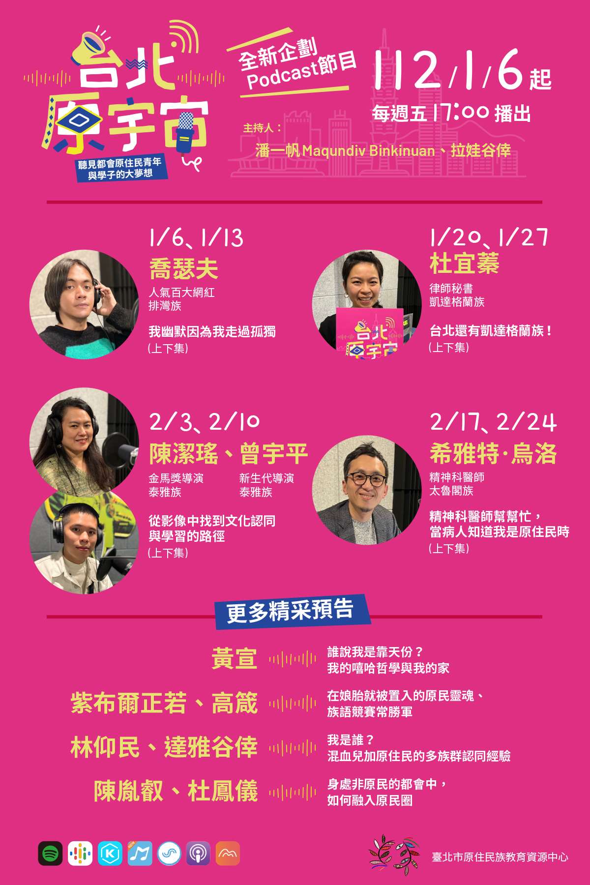 一、為擴大都會區原住民年輕學子在求學期間及社會適應之正 面影響力,本中心製作「台北原宇宙-Podcast節目」(以下 簡稱本節目),訪談臺北市原住民青年學子成長學習經驗, 並以輕鬆逗趣的故事分享,帶出感動人心的正向思考能 量。