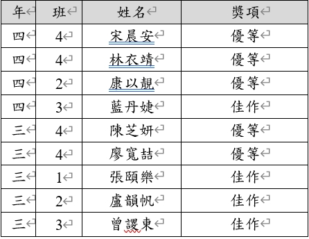 恭喜以下同學參加111年度校內「翰逸神飛」硬筆書法比賽獲獎