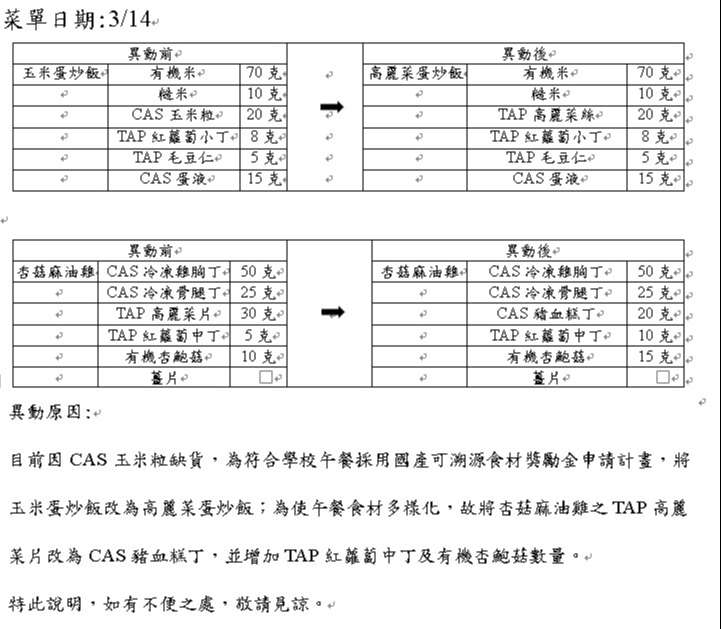 目前因CAS玉米粒缺貨,為符合學校午餐採用國產可溯源食材獎勵金申請計畫,將玉米蛋炒飯改為高麗菜蛋炒飯;為使午餐食材多樣化,故將杏菇麻油雞之TAP高麗菜片改為CAS豬血糕丁,並增加TAP紅蘿蔔中丁及有機杏鮑菇數量。