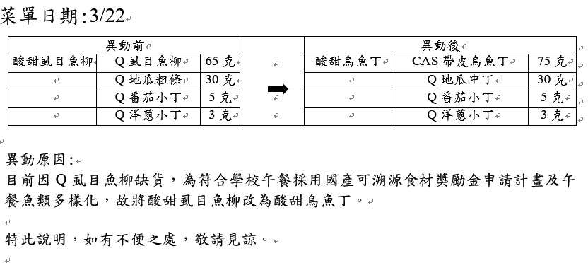 目前因Q虱目魚柳缺貨,為符合學校午餐採用國產可溯源食材獎勵金申請計畫及午餐魚類多樣化,故將酸甜虱目魚柳改為酸甜烏魚丁。