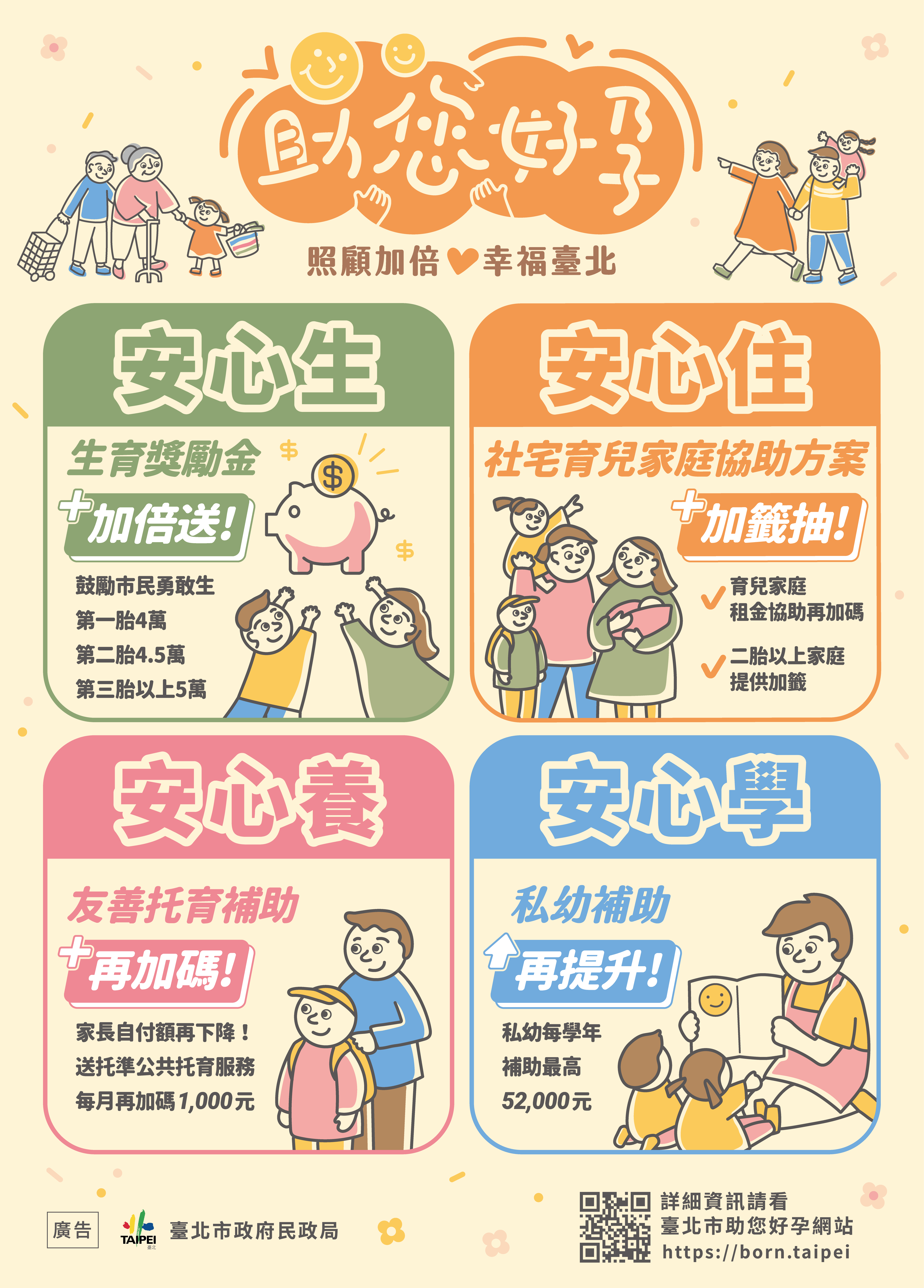 一、臺北市助您好孕專案推出生育獎勵金加倍送、社宅育兒家庭協助方案、友善托育補助再加碼、私幼補助再提升等措 施,更多友善育兒政策可至助您好孕網站查詢:https://born.taipei/