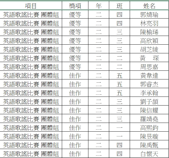 111學年度校內多語文競賽 二年級英語歌謠 團體組 比賽成績
