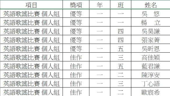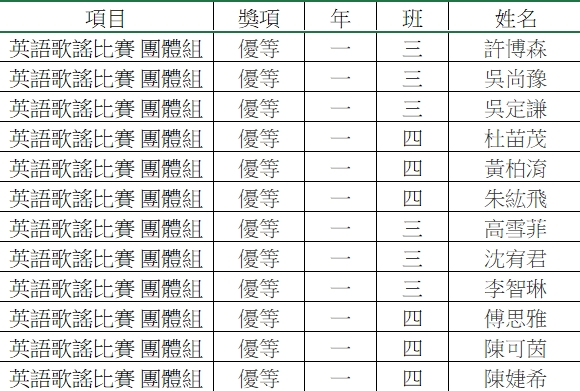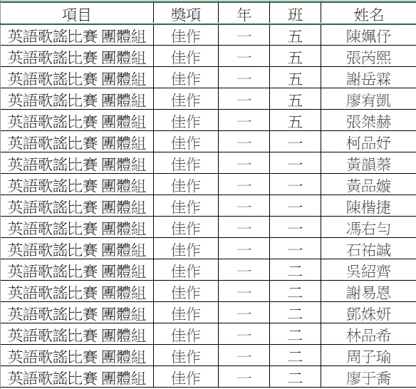 111學年度校內多語文競賽 一年級英語歌謠 團體組比賽成績