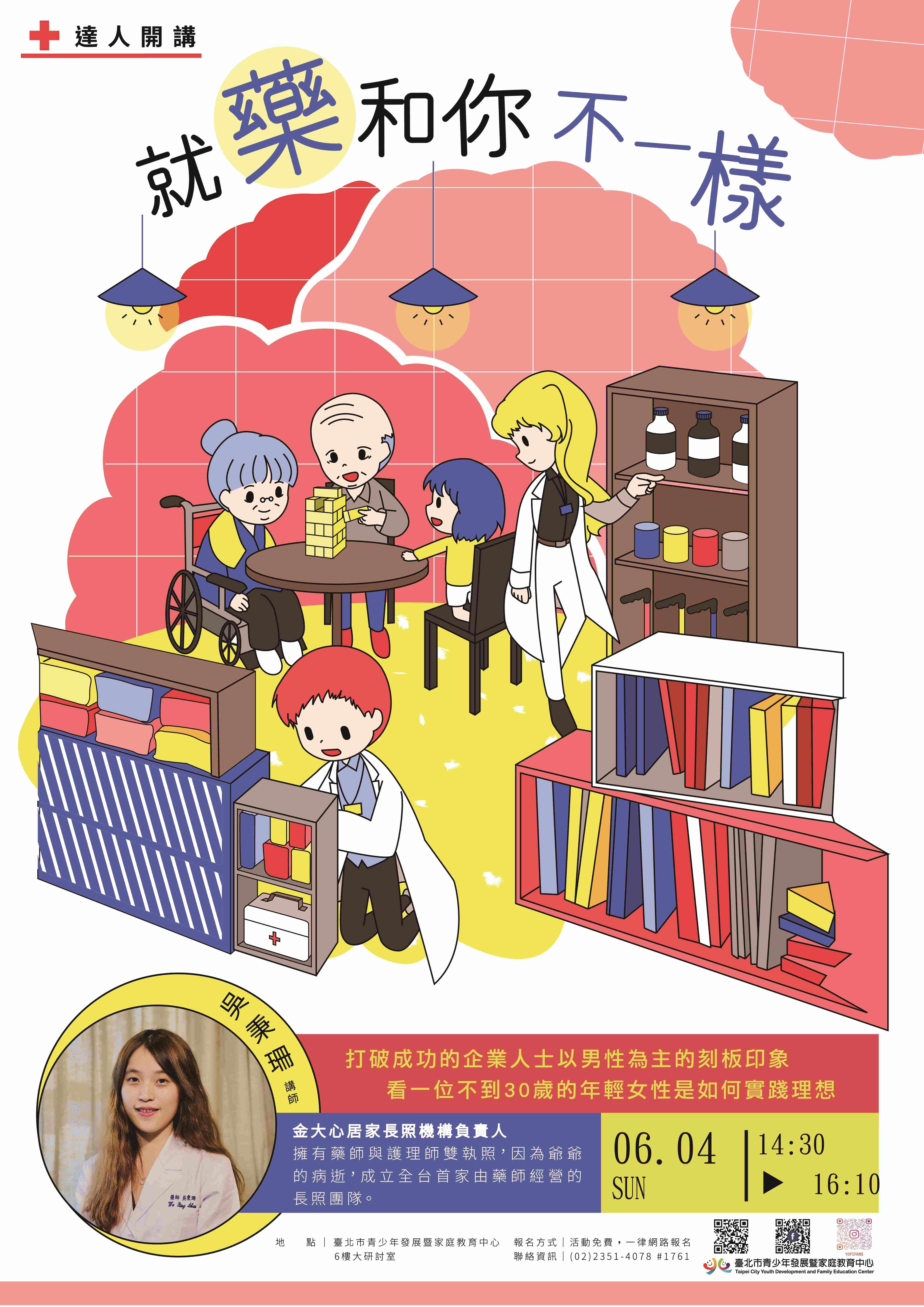 (一)90字:臺北市青少年發展暨家庭教育中心6月4日14:30舉 辦達人開講「就藥和你不一樣」,金大心居家長照機構 負責人吳秉珊老師與您分享她經營長照團隊的心路歷 程,以及過程中的體驗。活動免費,詳見青發家教中心 官網。 (二)60字:臺北市青少年發展暨家庭教育中心6月4日14:30舉 辦達人開講:就藥和你不一樣。吳秉珊與您分享她經營 長照團隊的心路歷程;活動免費詳見青發家教中心官 網。 (三)30字:青發家教中心6/4吳秉珊開講:就藥和你不一樣。 活動免費詳官網。 四、若對本活動有任何問題,請洽聯絡窗口:02-23514078轉 1761,莊先生。 五、檢附活動海報及Banner電子檔各1份,如需紙本海報請連繫 承辦人。