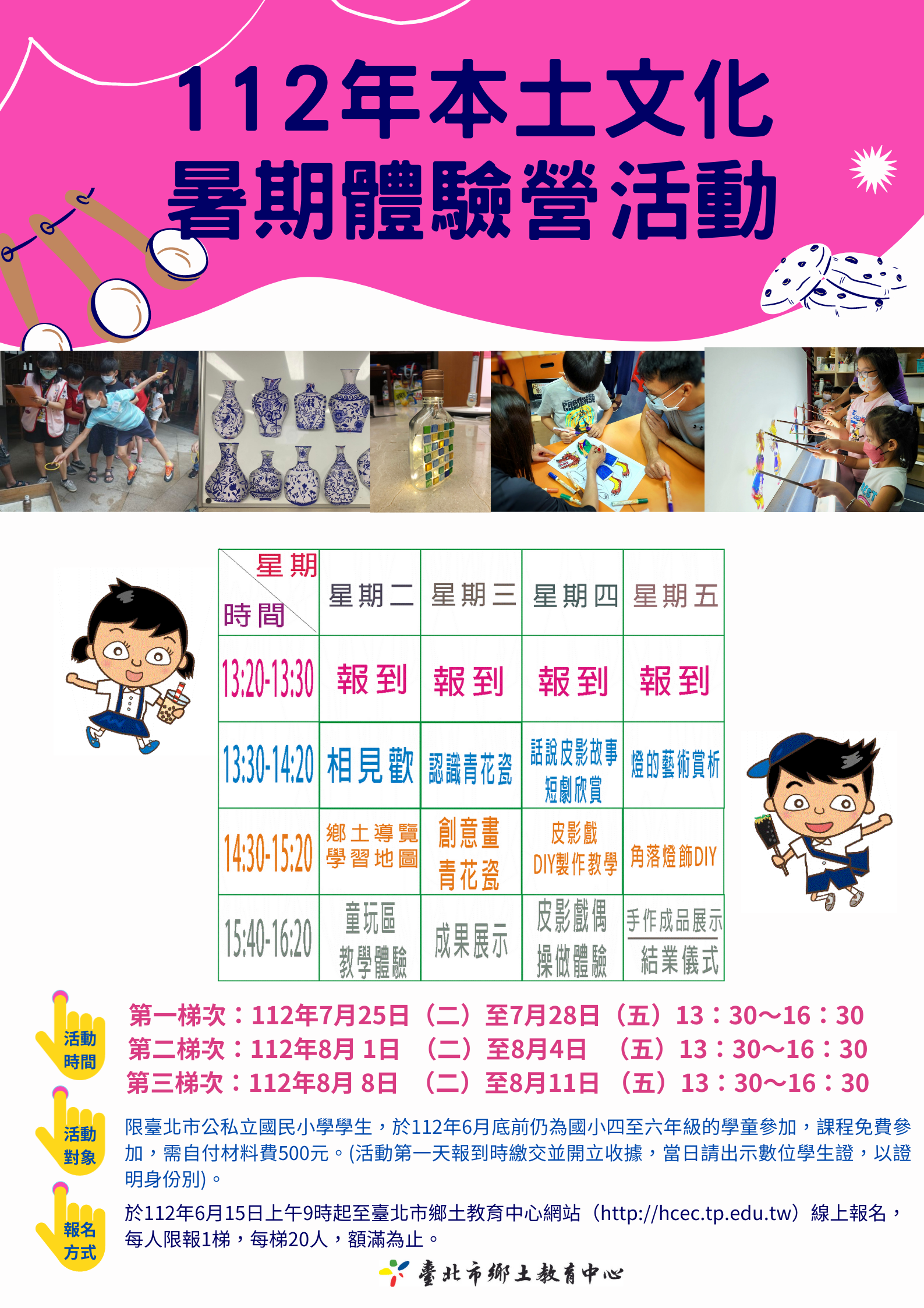(二)報名時間:於112年6月15日上午9時起至臺北市鄉土教育中心網站(http://hcec.tp.edu.tw)線上報名,每人限報1梯,每梯20人,額滿為止。課程免費參加,需自付材料費 500 元。