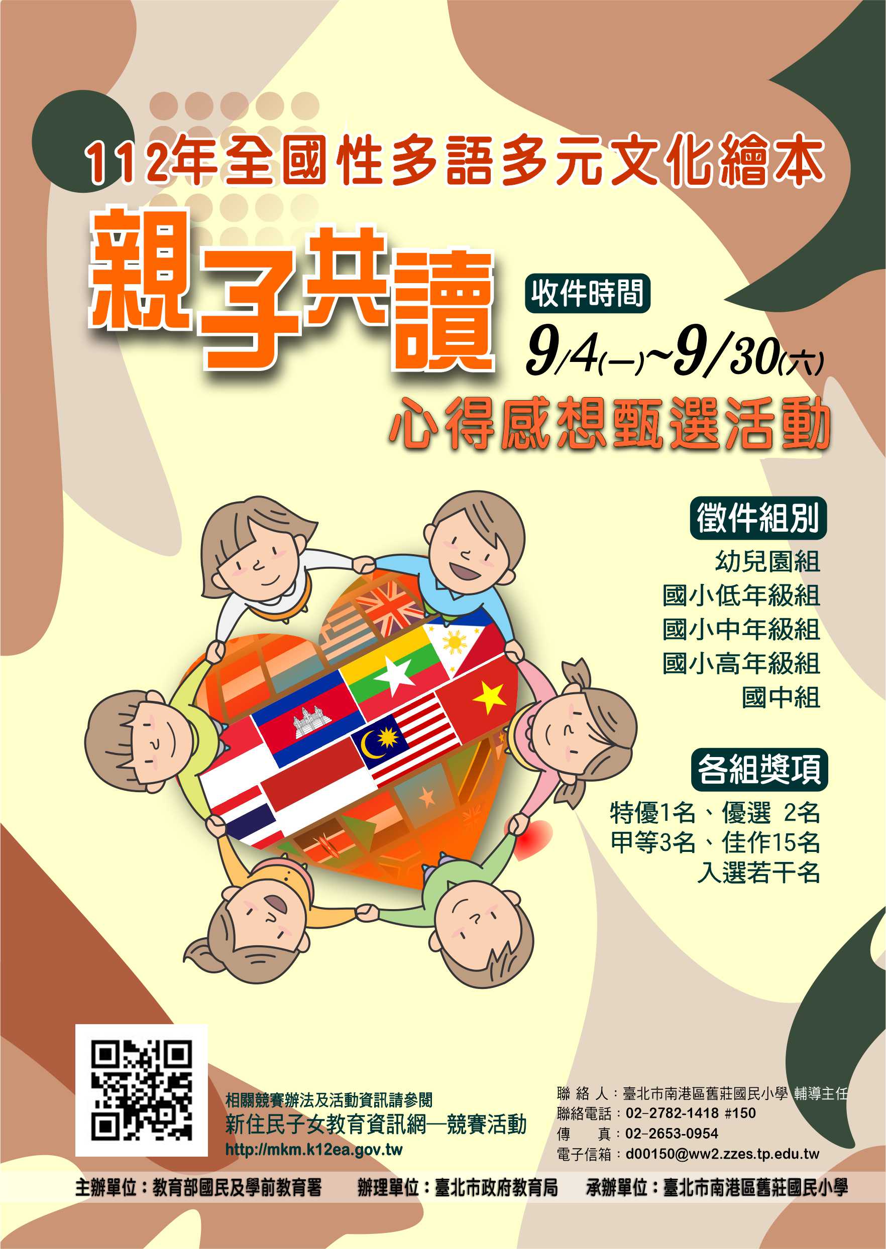 2、若學校統一報名請以學校為單位,統一將上述已簽名之授權同意書寄送臺北市南港區舊莊國小輔導(11572臺北市南港區舊莊街一段100號),請載明報名「全國性多語多元文化繪本親子共讀心得感想甄選」。