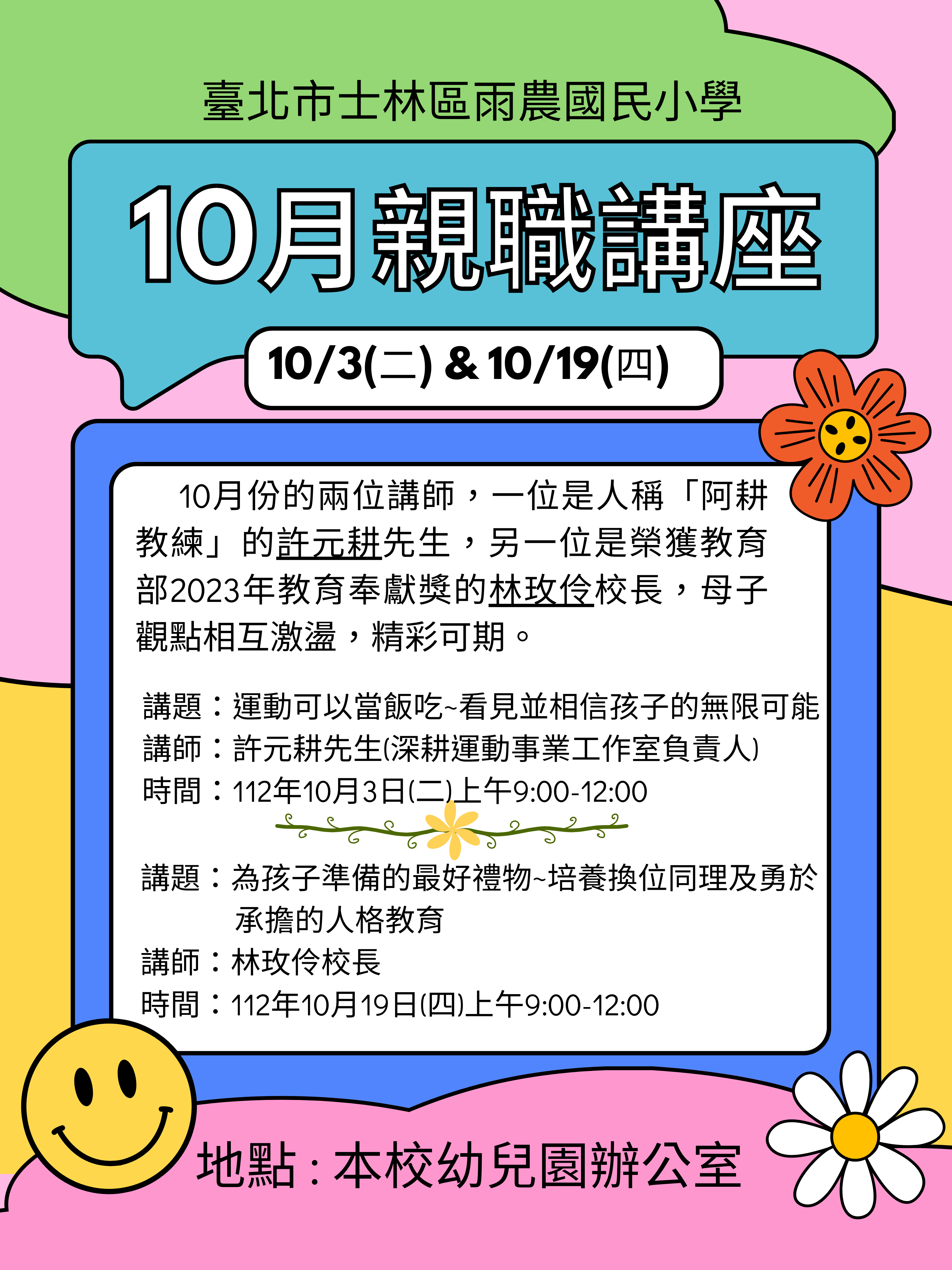 新學期輔導室規劃了四場精彩且與眾不同的親職講座,首波邀請人稱「阿耕教練」的許元耕先生,以及榮獲教育部2023年教育奉獻獎_林玫伶校長,親子兩人強強聯手,相互激盪出不同的觀點與火花。