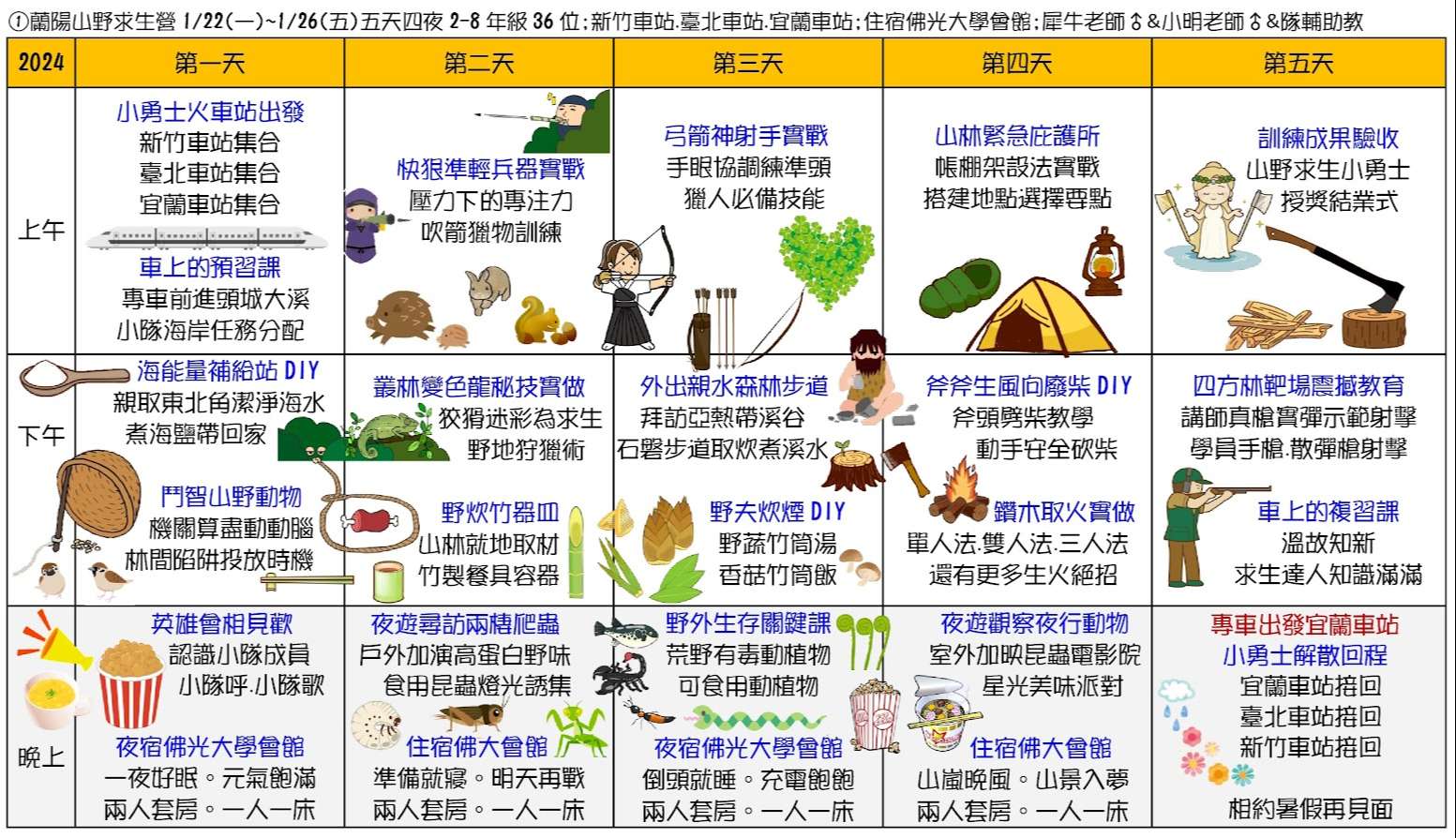 二、六種課程主題為:①蘭陽山野求生營(5天4夜)、②小琉球