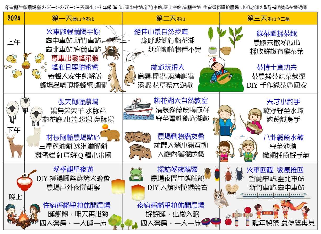 營(4天3夜)、⑤池上單車生態營(4天3夜)、⑥宜蘭生態農