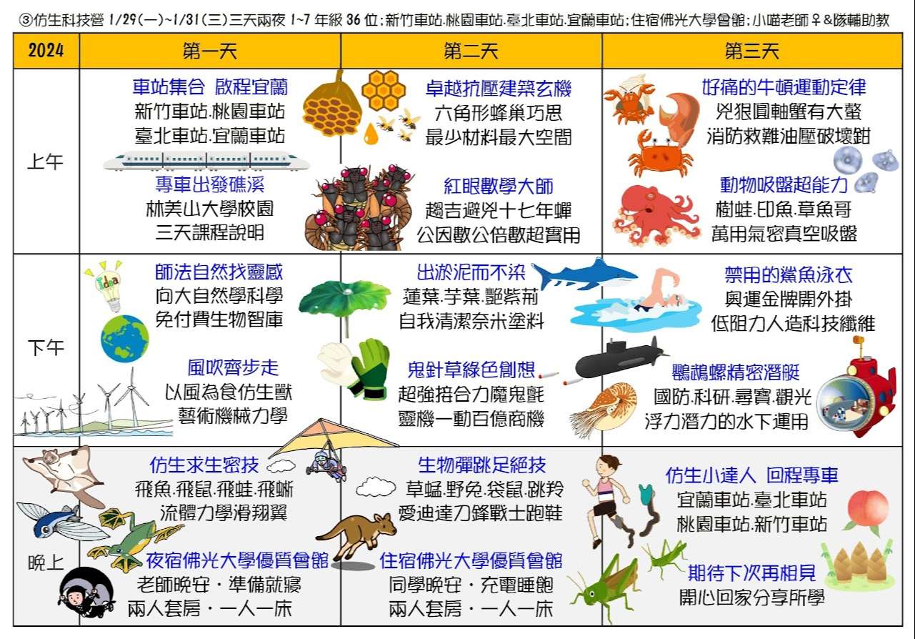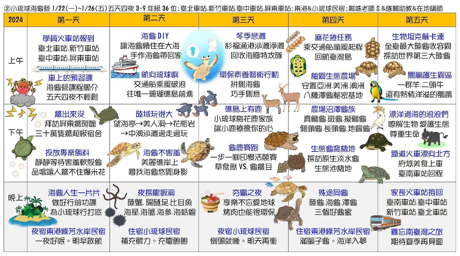 海龜營(5天4夜)、③仿生科技營(3天2夜)、④貓頭鷹飛羽