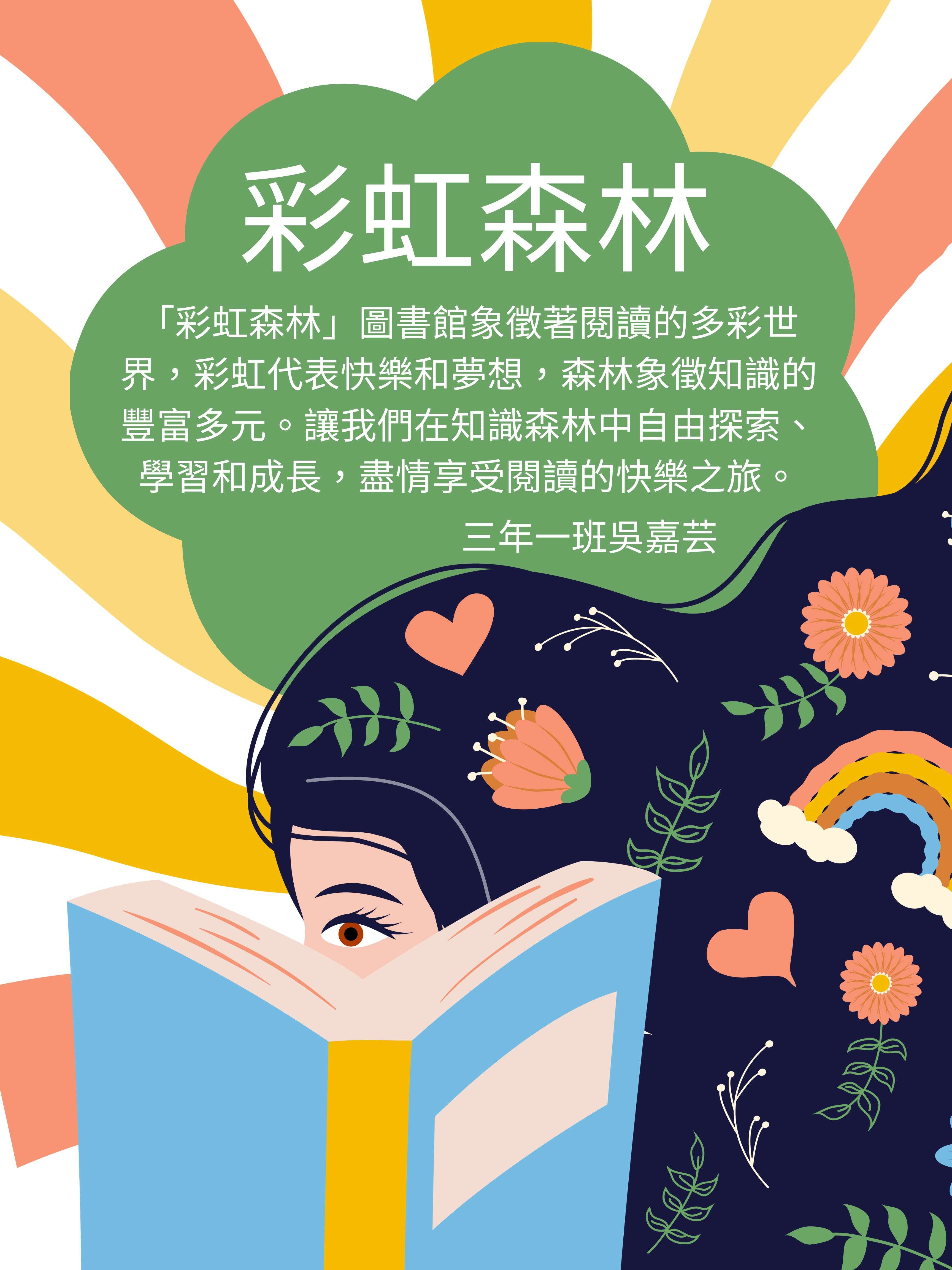 「彩虹森林」圖書館象徵著閱讀的多彩世界,彩虹代表快樂和夢想,森林象徵知識的豐富多元。讓我們在知識森林中自由探索、學習和成長,盡情享受閱讀的快樂之旅。 |