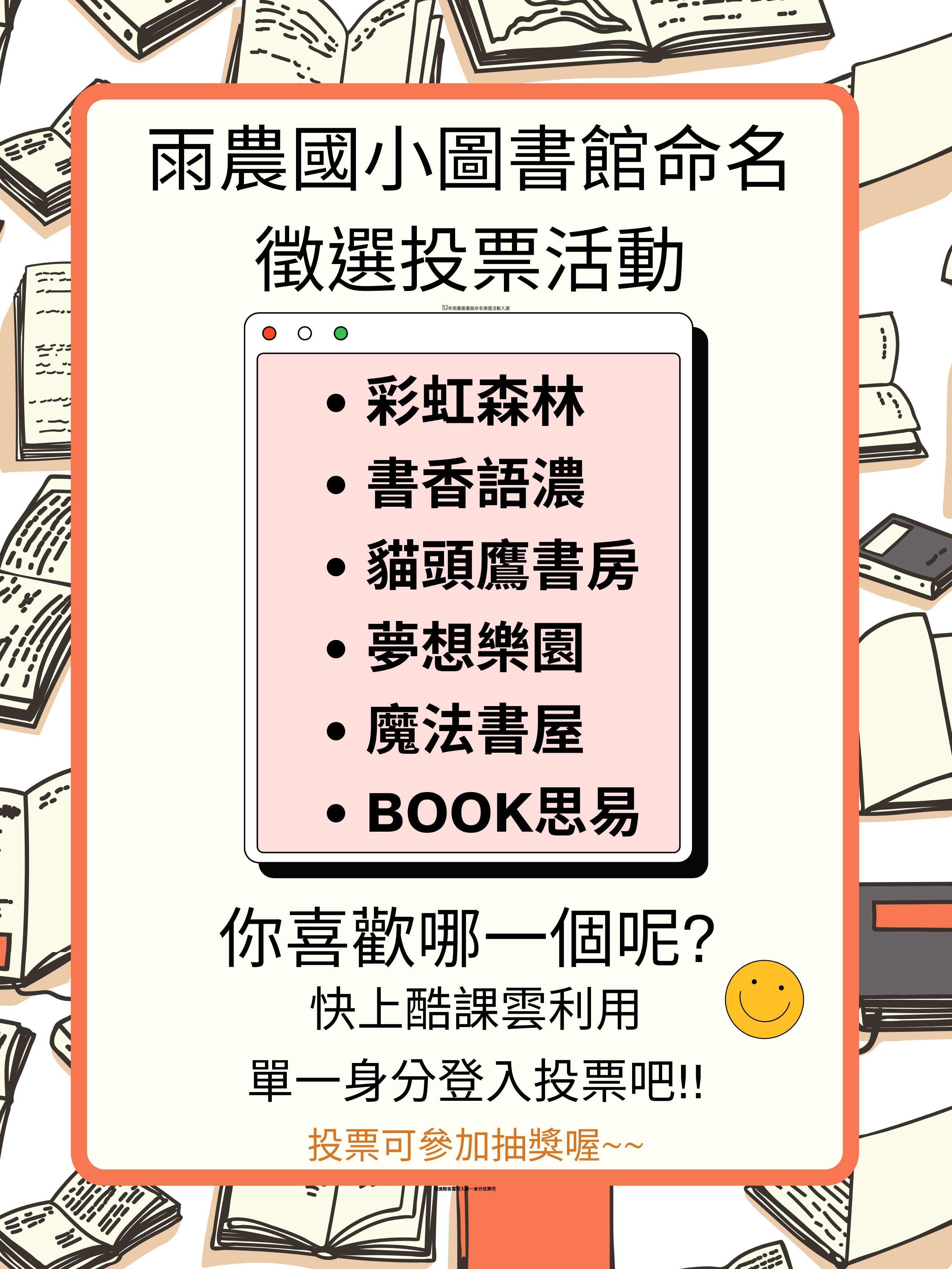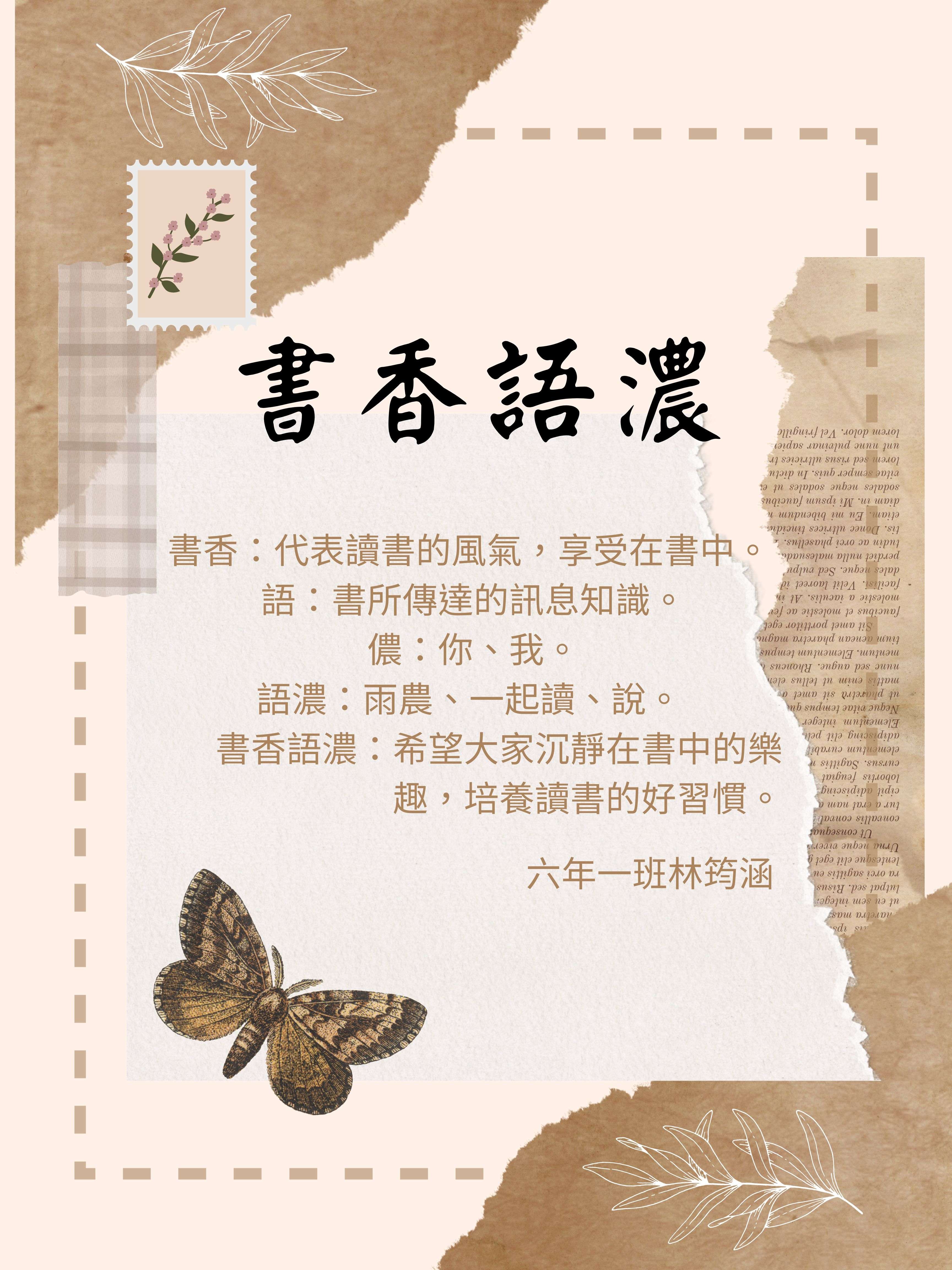 書香:代表讀書的風氣,享受在書中。 語:書所傳達的訊息知識。 儂:你、我。語濃:雨農、一起讀、說。書香語濃:希望大家沉靜在書中的樂趣,培養讀書的好習慣。 |