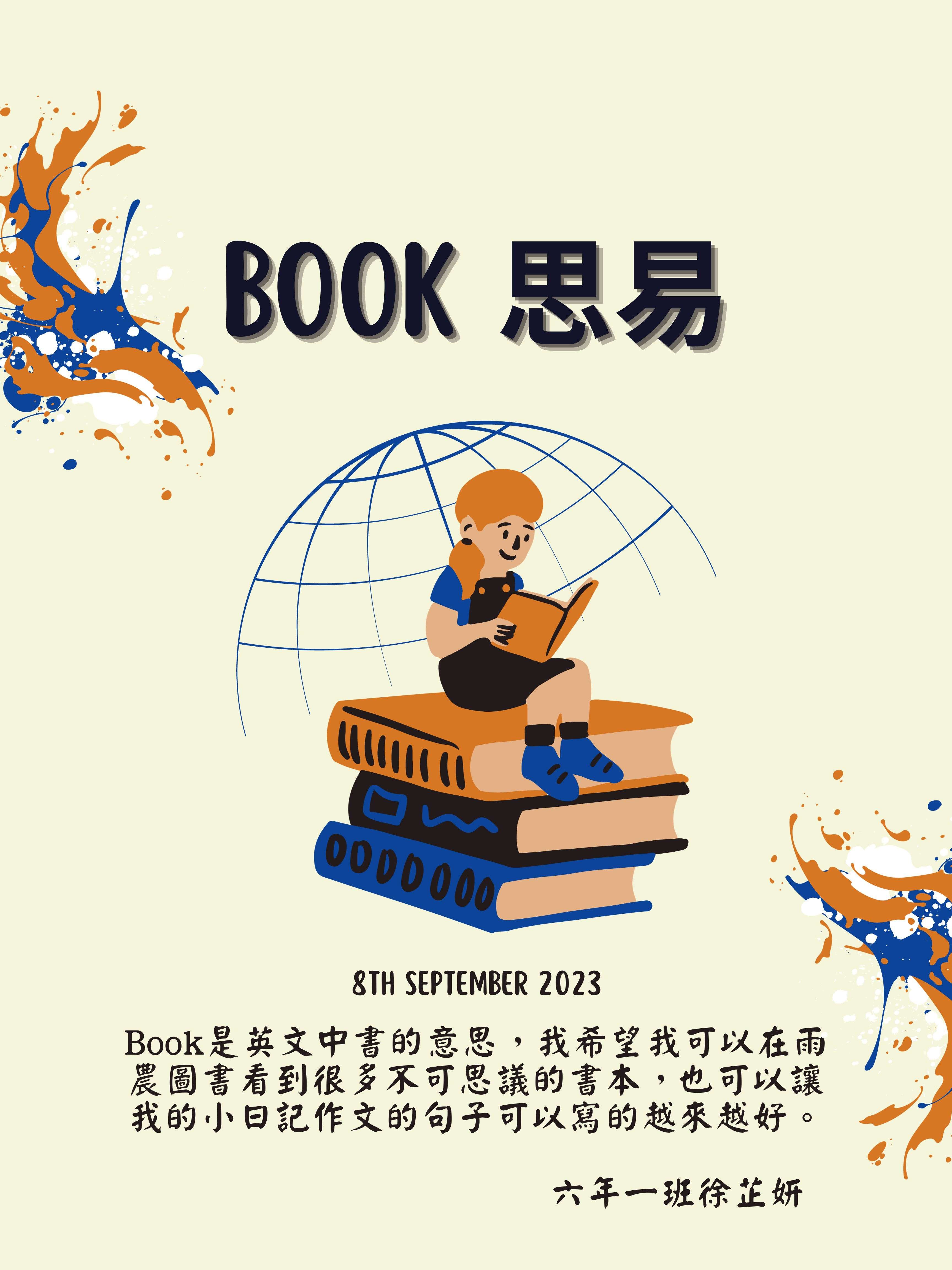 Book是英文中書的意思,我希望我可以在雨農圖書看到很多不可思議的書本,也可以讓我的小日記作文的句子可以寫的越來越好,思考更容易。 |