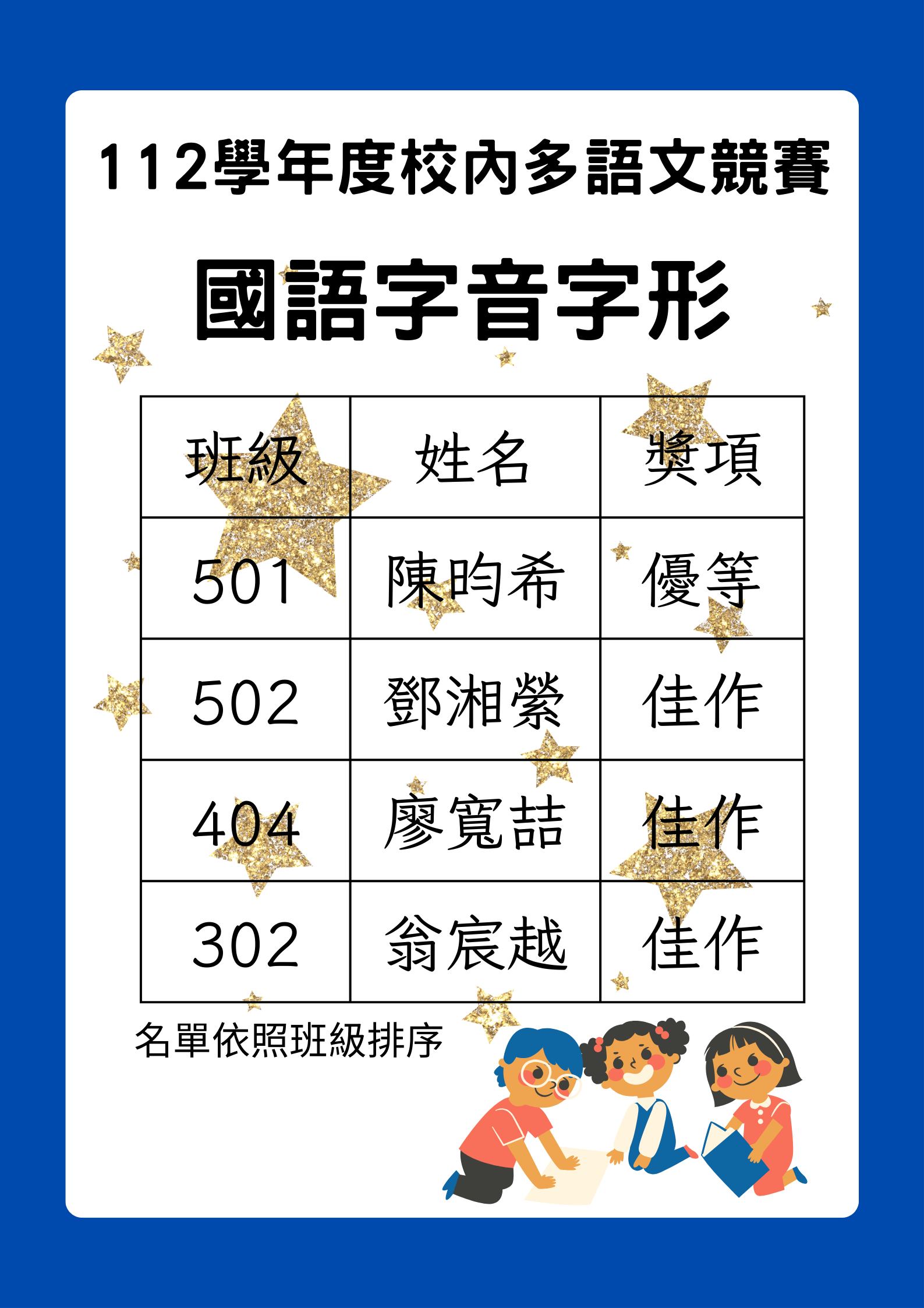112學年度校內多語文學藝競賽獲獎名單-國語字音字形