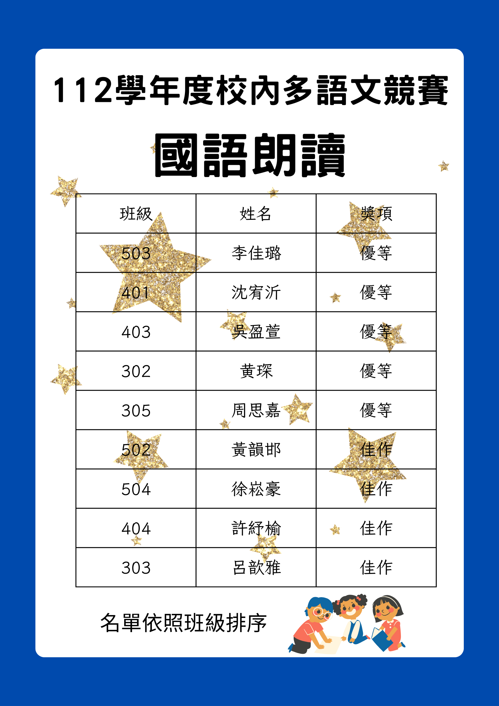 112學年度校內多語文學藝競賽獲獎名單-國語朗讀