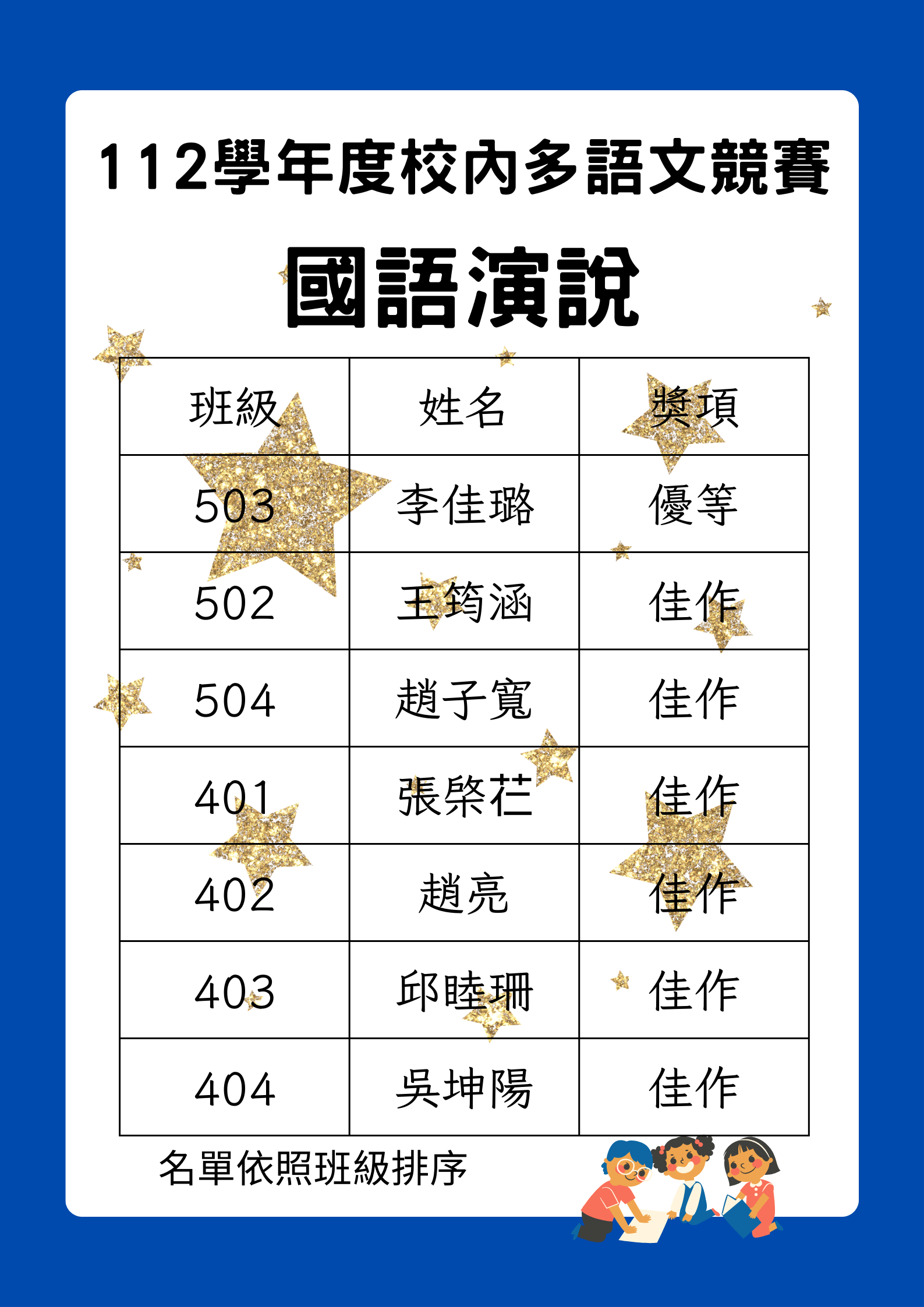112學年度校內多語文學藝競賽獲獎名單-國語演說