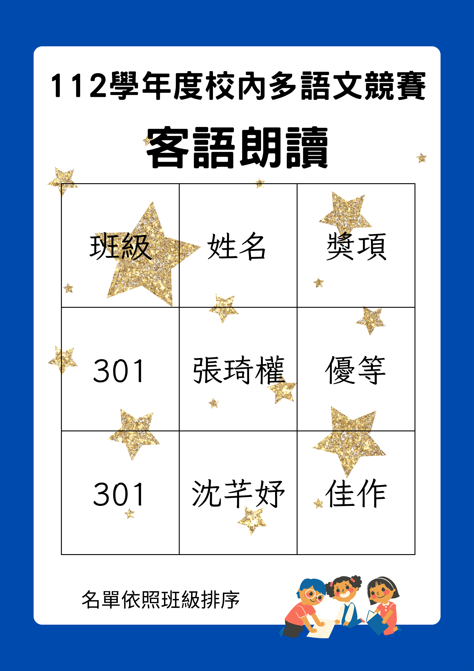 112學年度校內多語文學藝競賽獲獎名單-客語朗讀