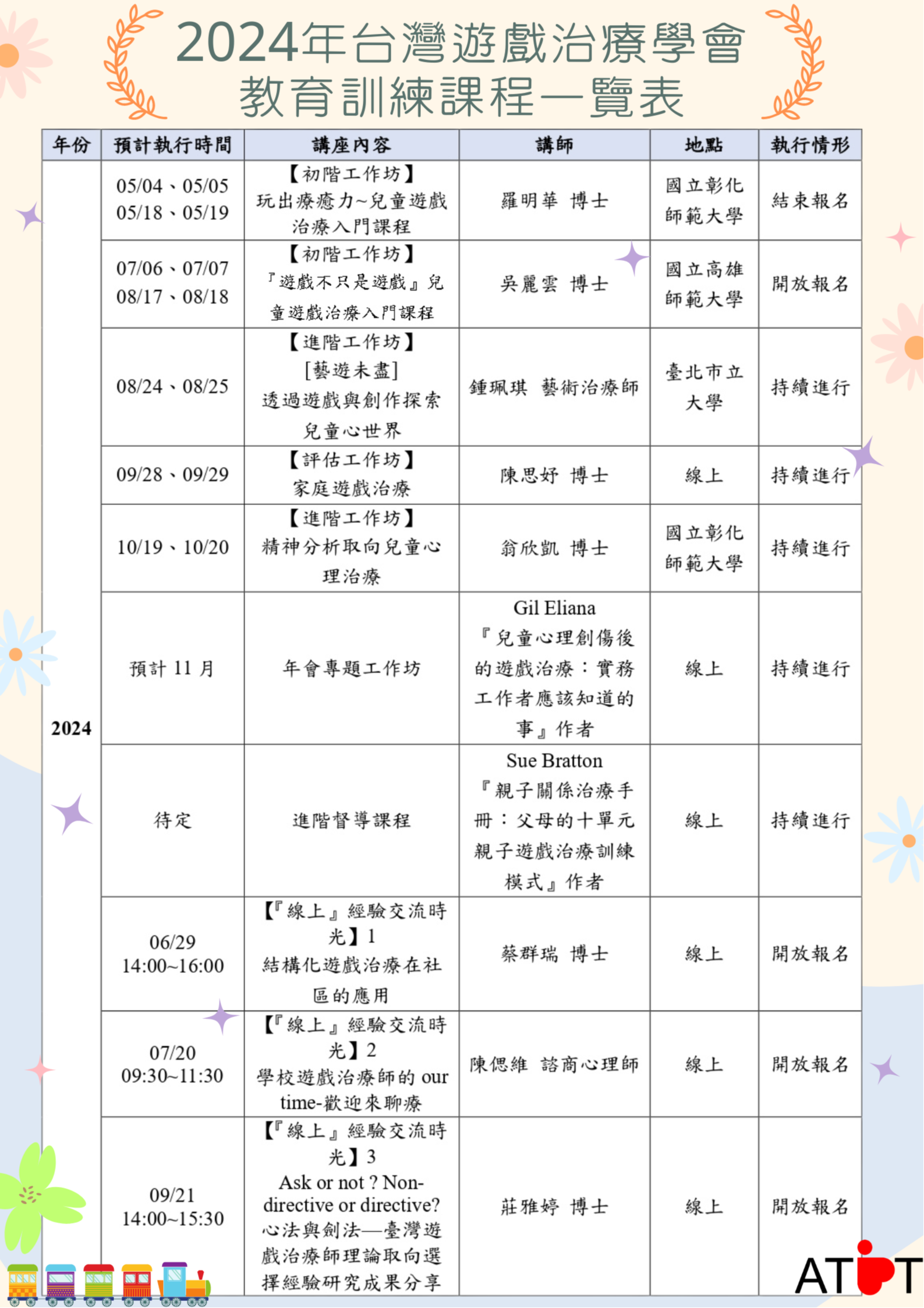 一、台灣遊戲治療師認證積分課程─2024『線上』經驗交流時光活動及時間,請參閱附件。
