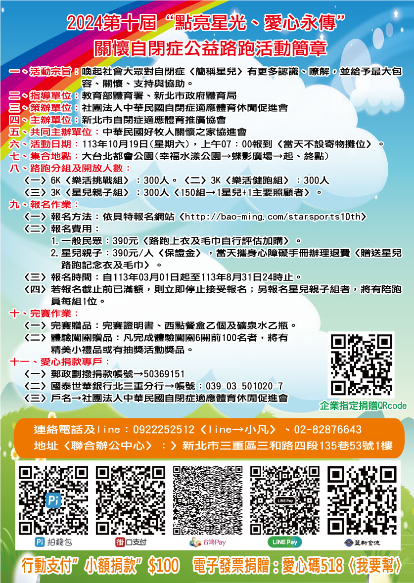 三、然為讓星兒家庭們能走到戶外與一般民眾享有同樣的體育 休閒生活,遂策畫辦理此項關懷自閉症公益路跑活動,相關內容如下: