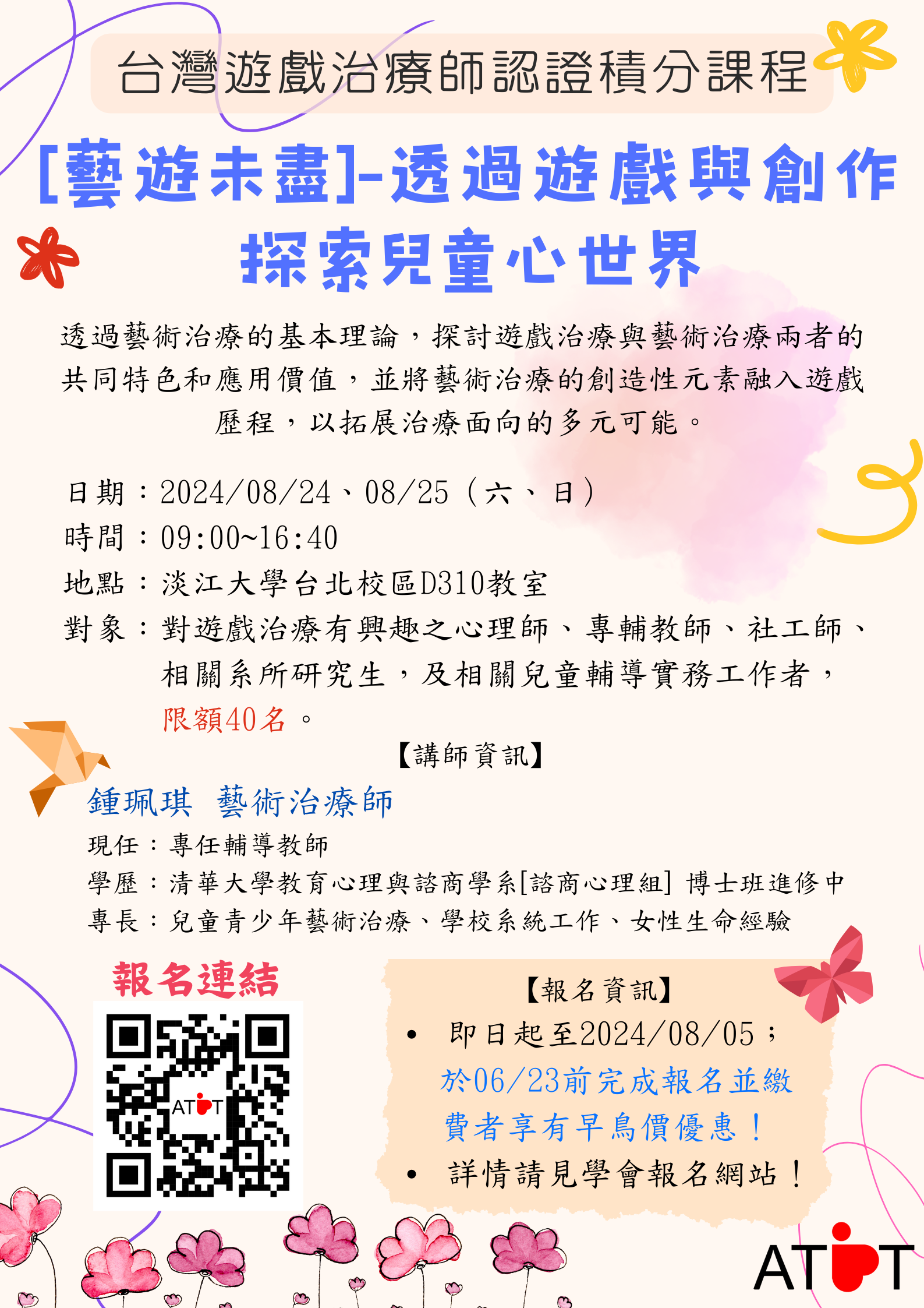 一、 2024 台灣遊戲治療師認證積分課程【2024 台灣遊戲治療師認證積分課程】:「藝遊未盡-透過遊戲與創作探索兒童心世界」課程時間及講師資訊。