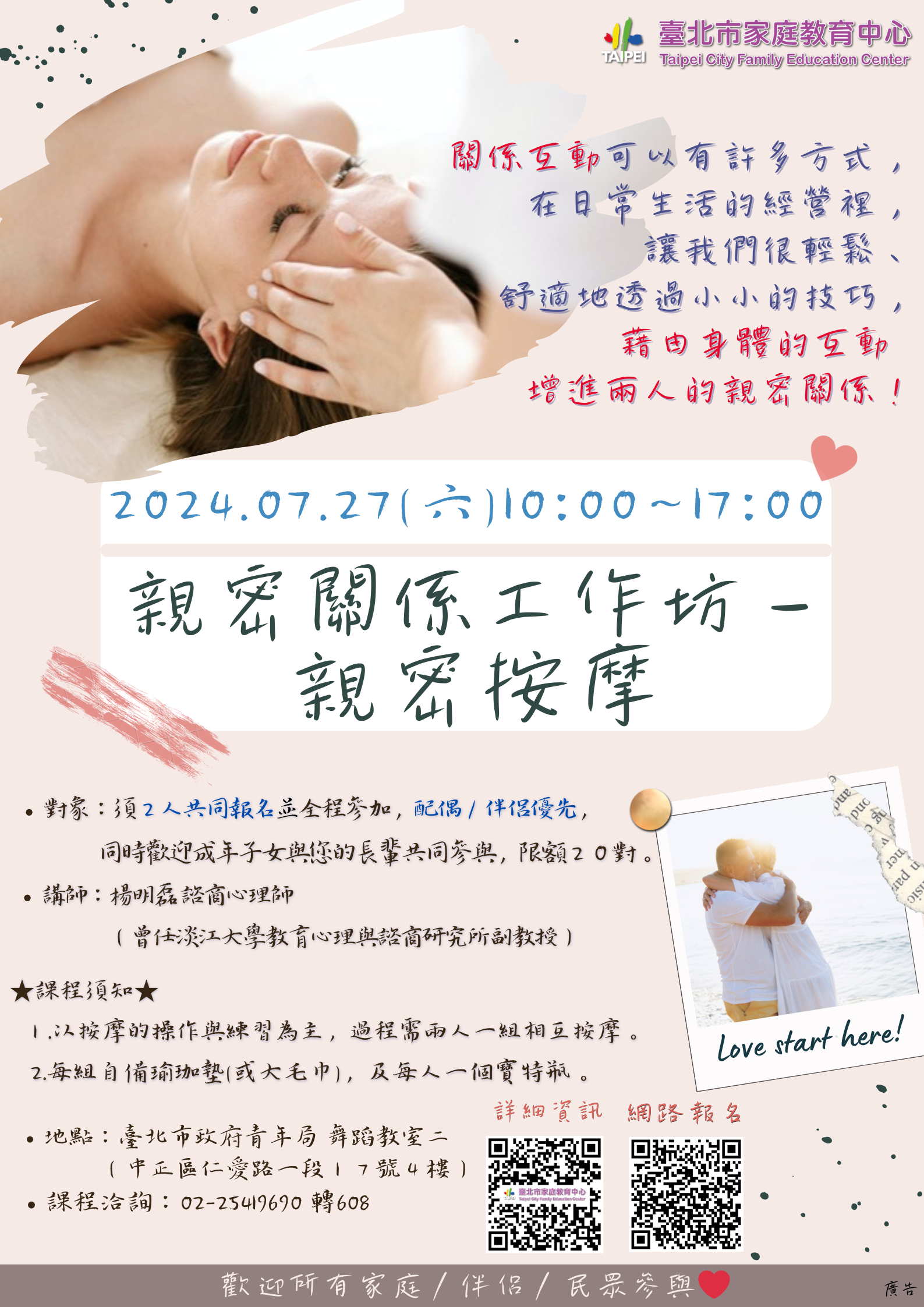 歡迎參加臺北市家庭教育中心7月27日舉辦之「親密關係工作坊-親密按摩」免費課程,藉由身體的互動輔以輕鬆舒適的技巧,增進彼此的親密關係!上網或電洽25419690轉608。