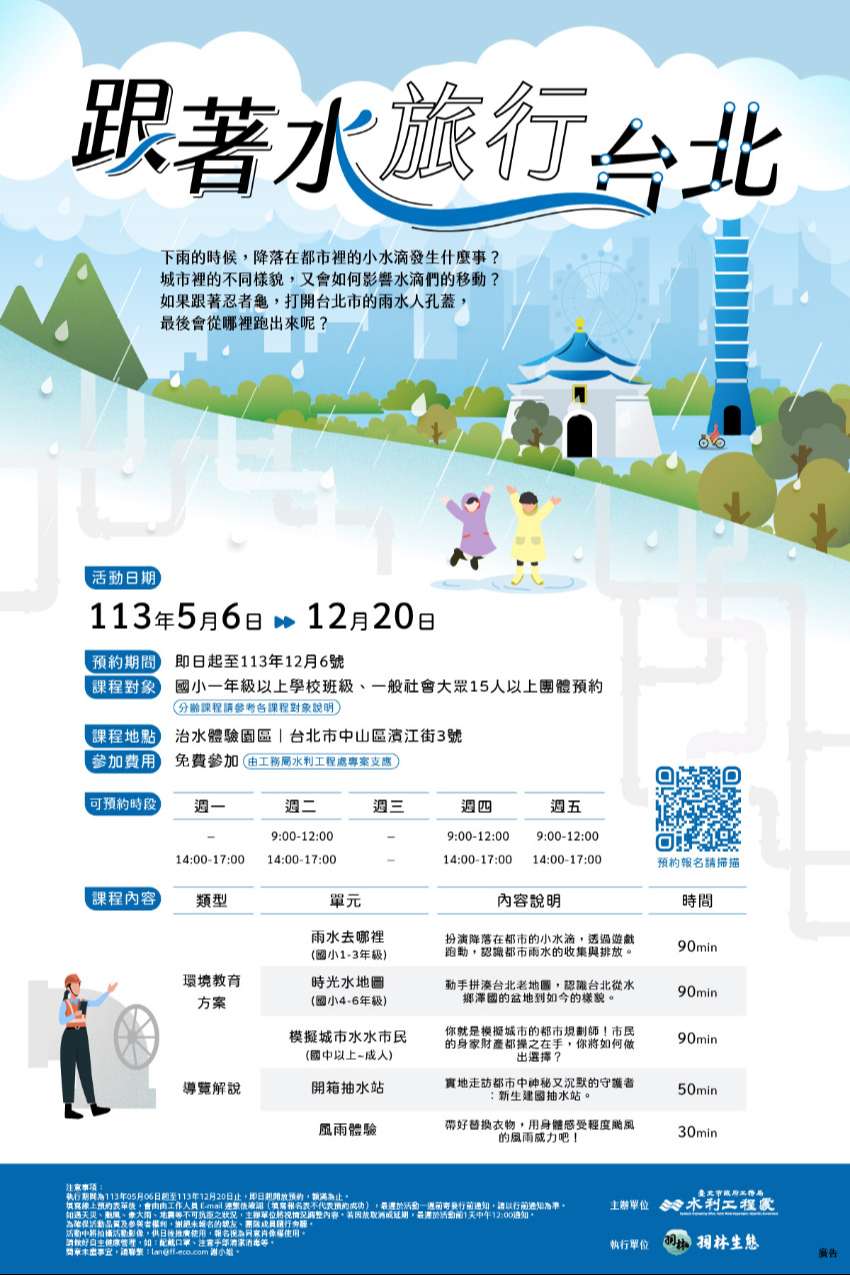 課程包含防減災與氣候變遷調適議題,可搭配國中小 及高中之社會與自然領域教學,即日起至113年12月6日開 放國小一年級以上學校班級及一般社會團體免費預約,預 約網址為https://reurl.cc/vvk8LA。