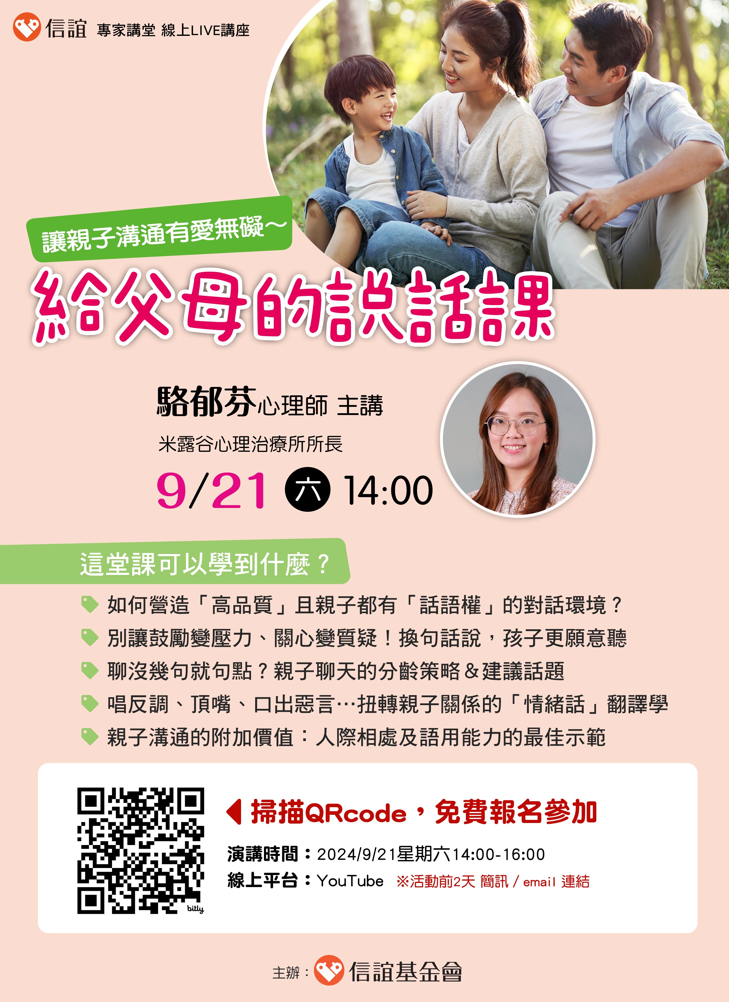 本場講座由駱郁芬(兒童臨床心理師)主講,將提供保有良好親子關係的分齡溝通策略,陪爸媽拆解日常親子對話的惱人狀況,練習和不同年齡孩子都能順利搭上線的方法。講座大綱如下: