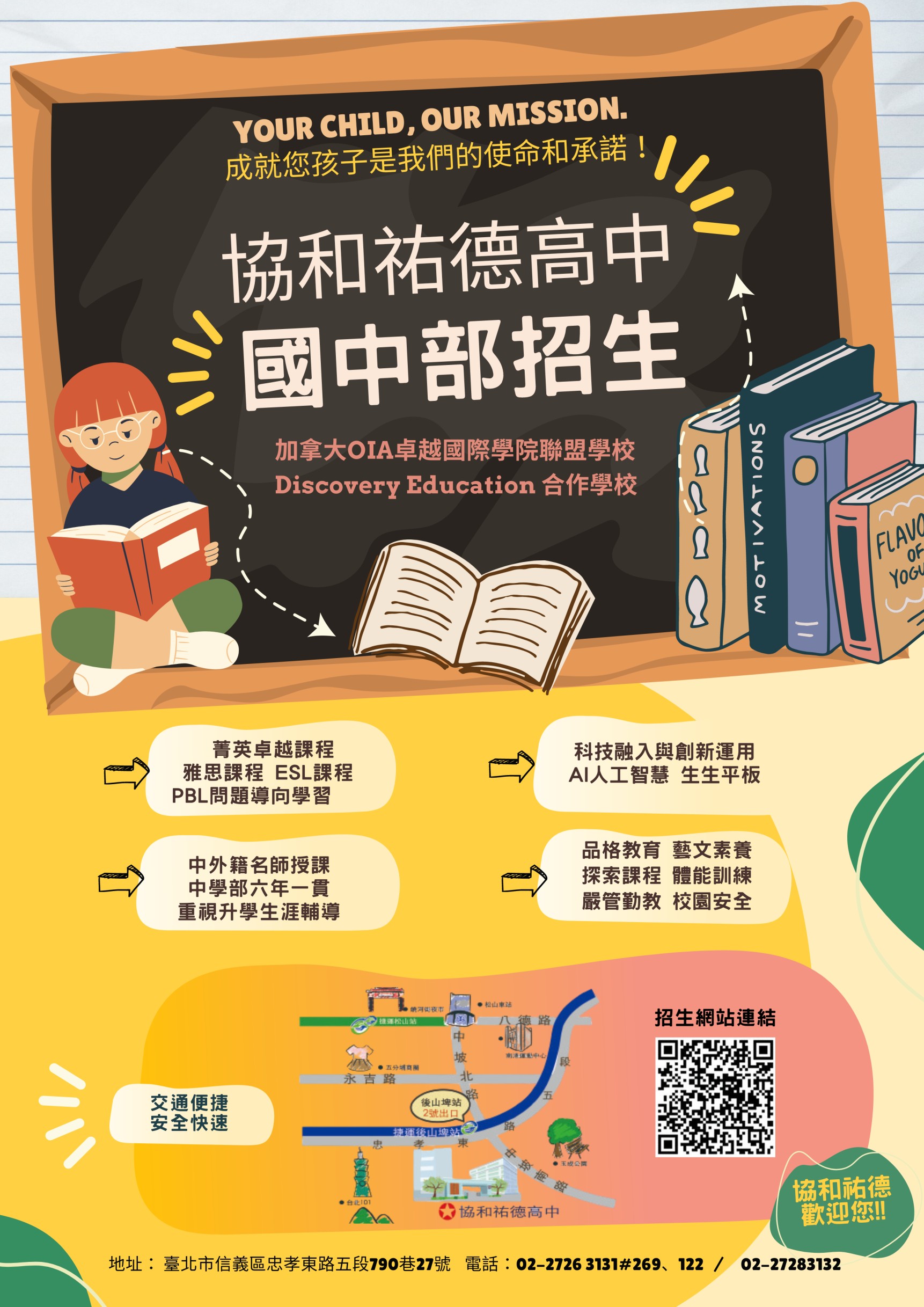 臺北市協和祐德高級中等學校將於114學年度招收國中部七年級學生兩班共80人,鼓勵四、五、六年級學生家長參加各場次招生說明會。(請掃描QR Code)