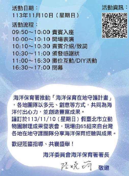 海保署訂於113年11月10日(星期日)假臺北市立動物園大門廣場舉辦旨揭活動,為落實該署海洋保育行動在地化,配合推動「海洋保育在地守護計畫」,以棲地復育行動、海洋保護區守護、友善釣魚行動、海洋保育推廣及 潔淨海洋行動五大主題,共同參與海洋生態保育行動。邀請大家一同共襄盛舉!