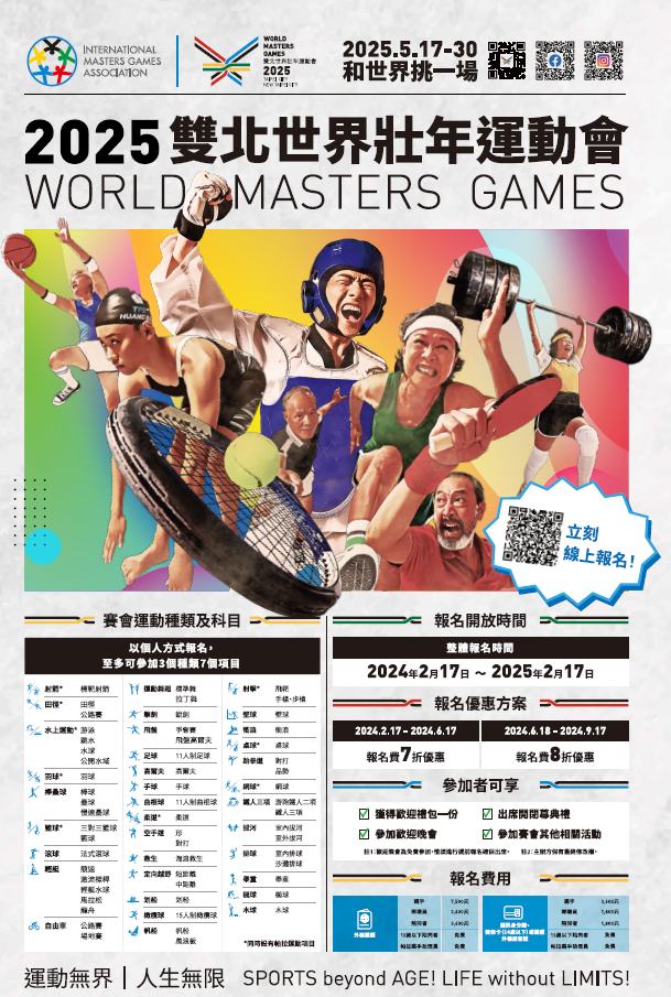 2025雙北世界壯年運動會於2025年5月17至30日舉行,共有35種運動種類其中包含帕拉運動組別,年滿30歲無需選拔即可參賽,今年2月17日官網開放報名,等你一起和世界挑一場!