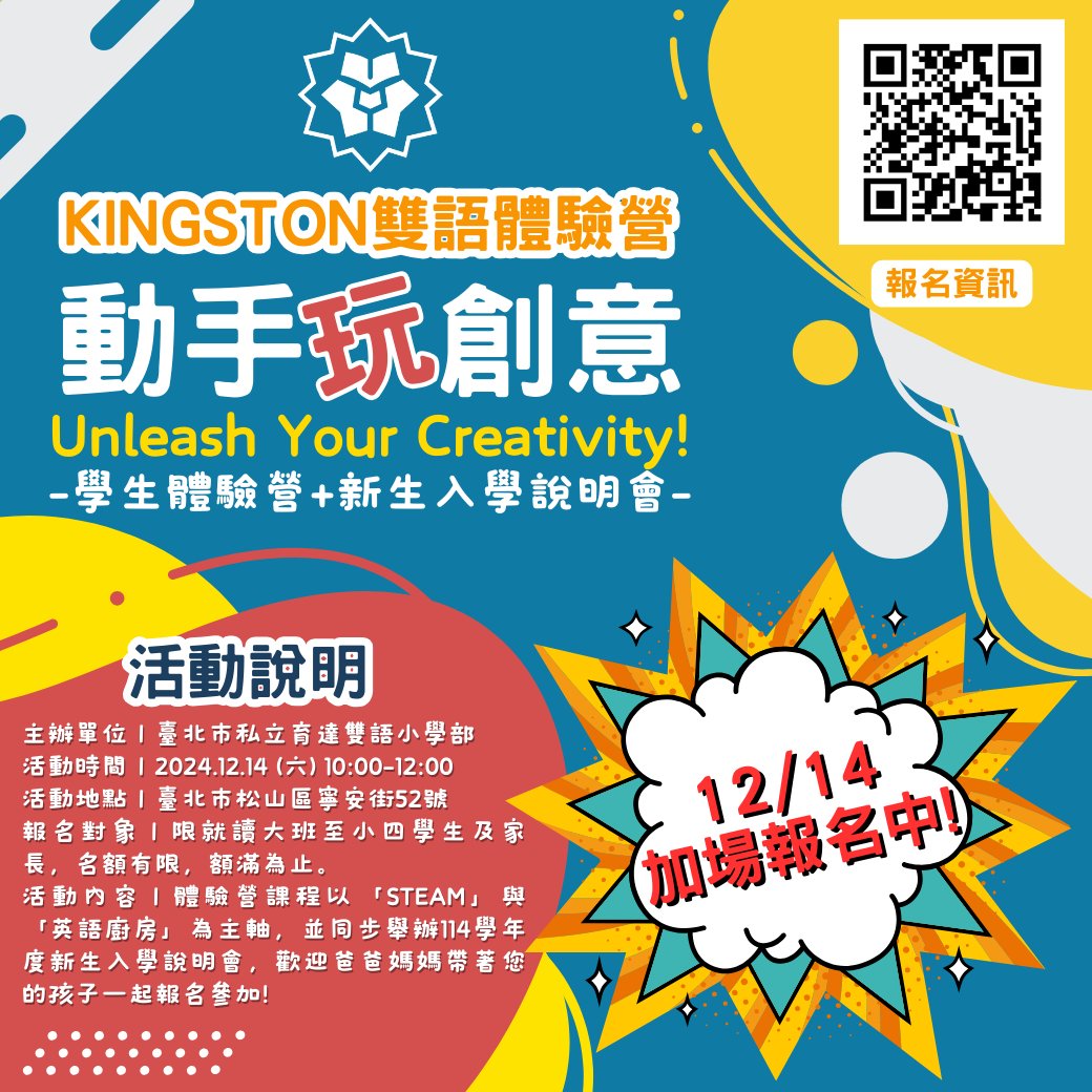 一、目的:點燃孩子的創意火花--【動手玩創意-Kingston雙語體驗營】。在全球化的時代,雙語能力是孩子未來發展的重要資產,本次Kingston雙語體驗營集結本校外師與中師,以「STEAM」與「英語廚房」為主題,設計一系列豐富有趣的體驗課程,除了規劃精采的手作體驗與科學實驗,我們也在同一時間安排114學年新生入學說明會,深入介紹本校的課程規劃與環境導覽,並解答您的所有疑問,歡迎家長帶著您的孩子一起報名參加!