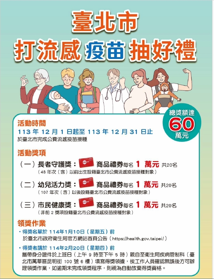 凡設籍本市之公費流感疫苗接種對象,113年12月1日至12 月31日期間於本市合約醫療院所或接種站接種流感疫苗者,均符合活動抽獎資格。