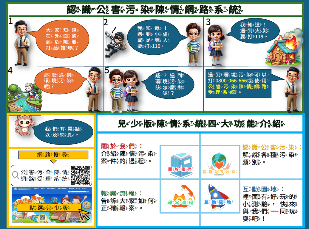 為便民服務,環管署提供民眾檢舉陳情環境污染情事,包含免付費電話(0800066666)、公害陳情網路受理系統、 手機公害報報APP、書面、電子郵件、傳真等多元陳情管 道;又為落實兒童及青少年知悉該類權益,故於113年起新增「公害污染陳情網路受理系統-兒少版」提供介紹及小遊戲等內容,期透過寓教於樂落實環境教育(連結如下: https://ww3.moenv.gov.tw/Public/Child.aspx)