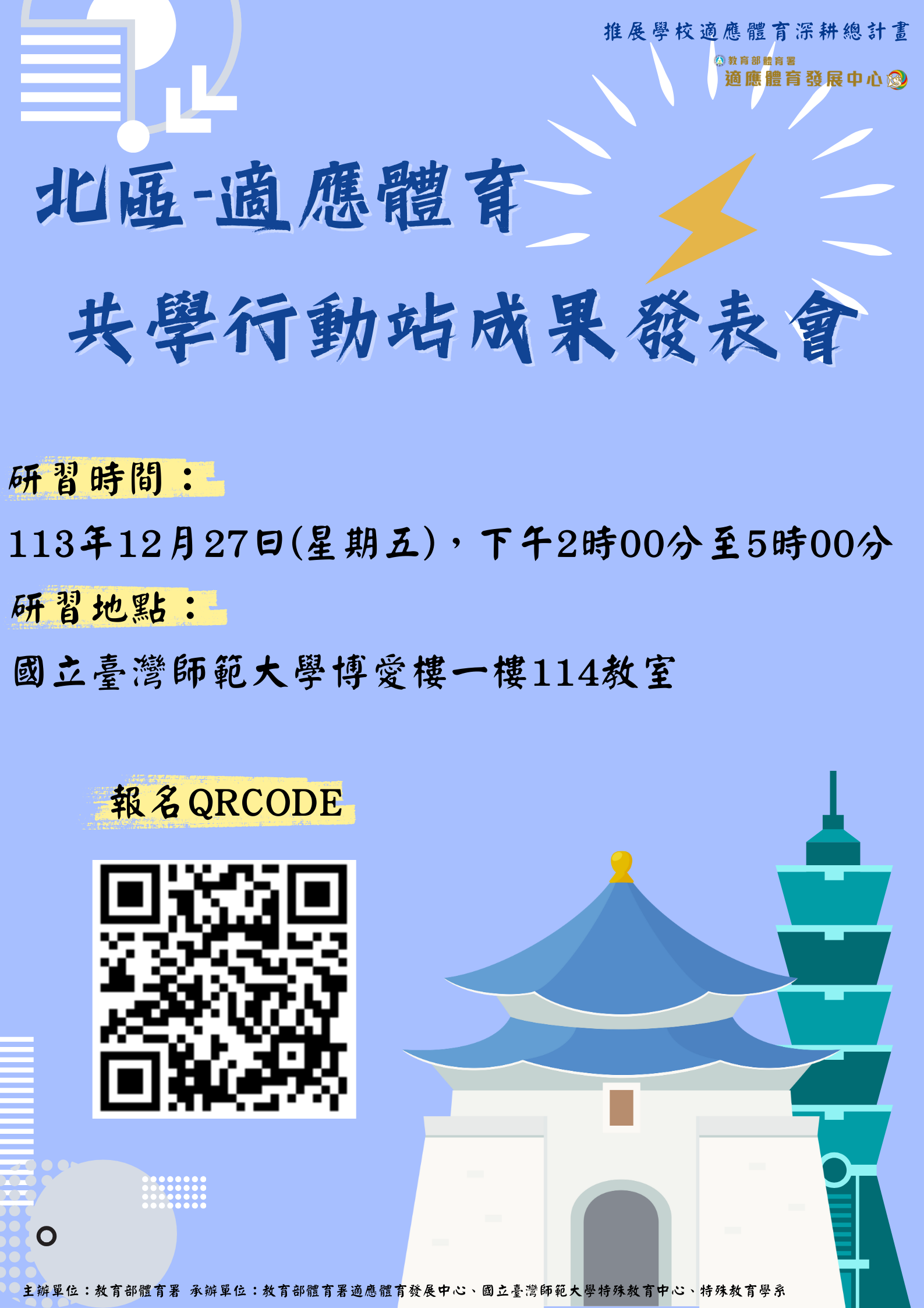 教育部體育署委託國立臺灣師範大學於113年12月27日辦理「北區—適應體育共學行動站成果發表會」研習資訊,歡迎有意願報名者,參閱相關計畫及海報資訊。